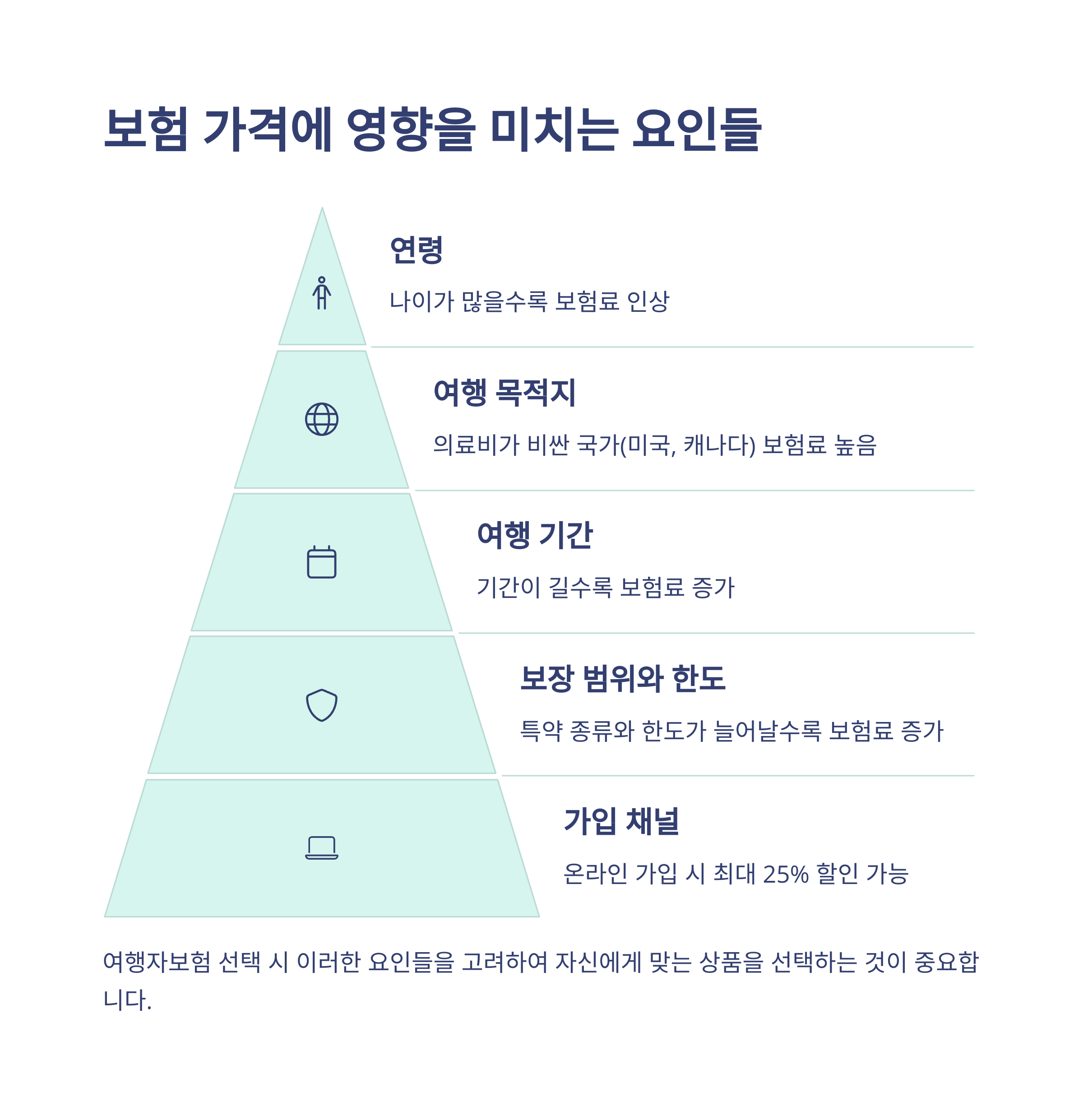 - 여행지 위험도: 미국, 캐나다처럼 의료비 비싼 나라일수록 보험료 ↑
