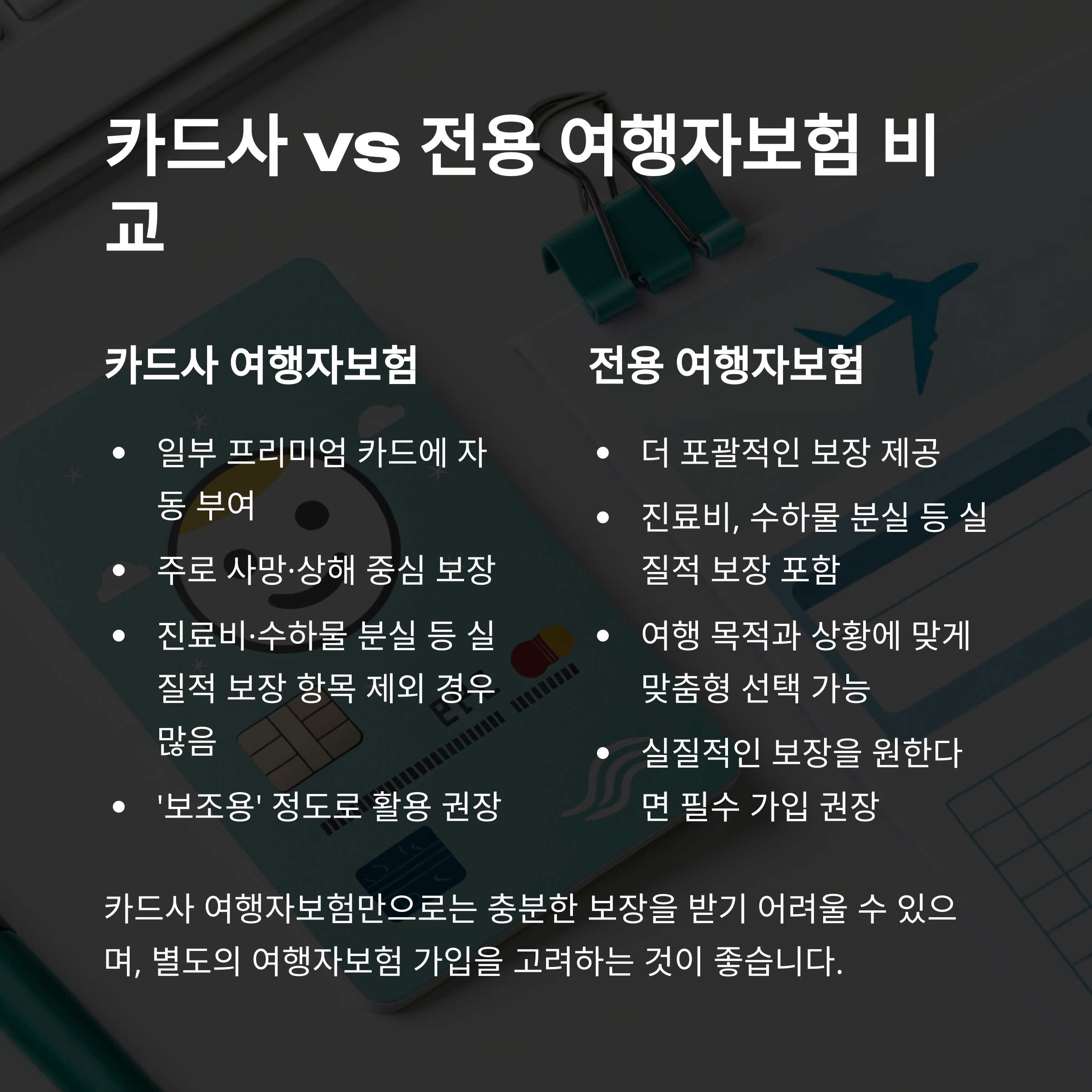 카드사 여행자보험은 대개 사망·상해만 보장되며, 의료비나 휴대품 분실 등 실속 항목은 빠져 있어 단독 활용은 부족해요.