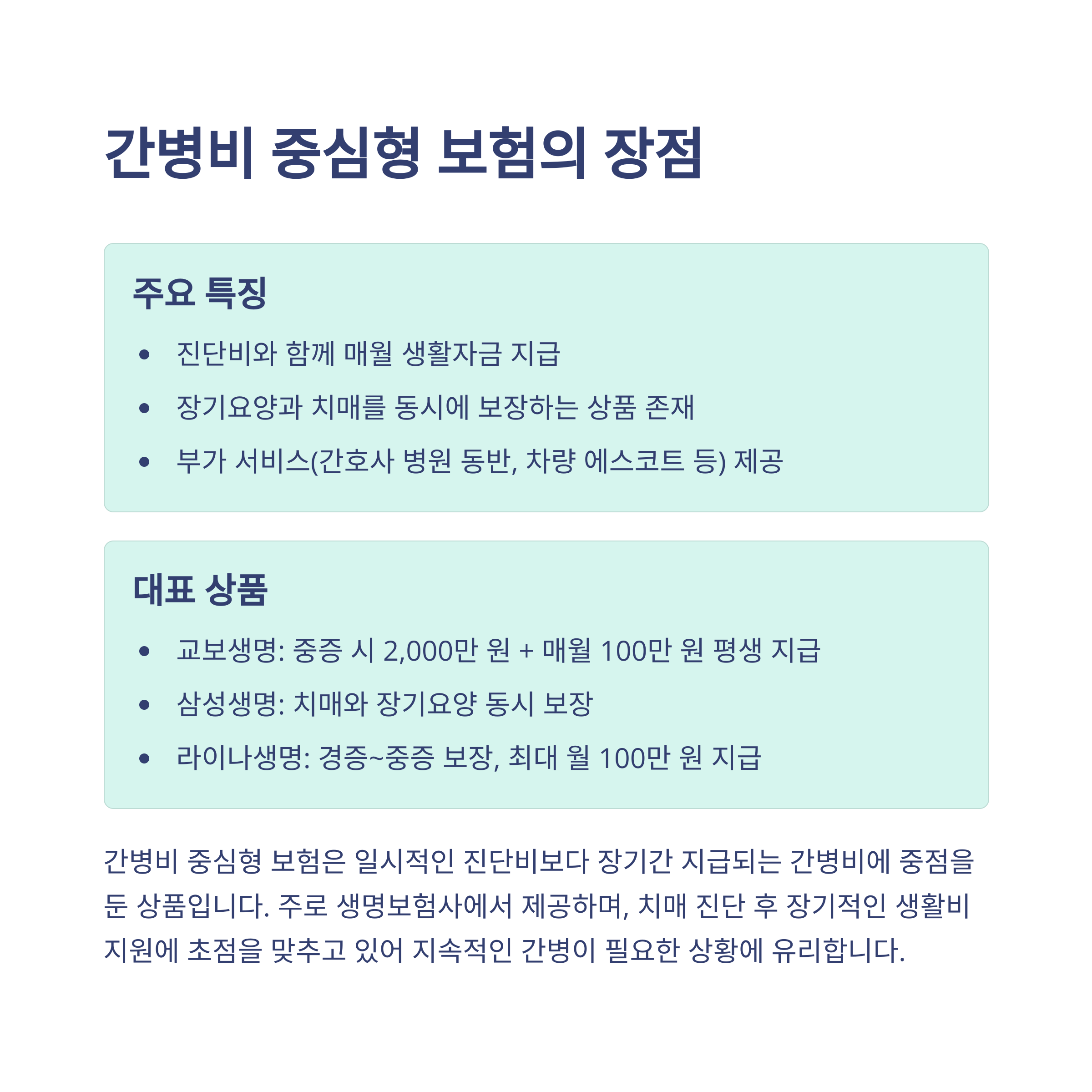 | 간병비 중심형 | 진단 후 매월 생활자금 지급 | 교보생명, 삼성생명 |