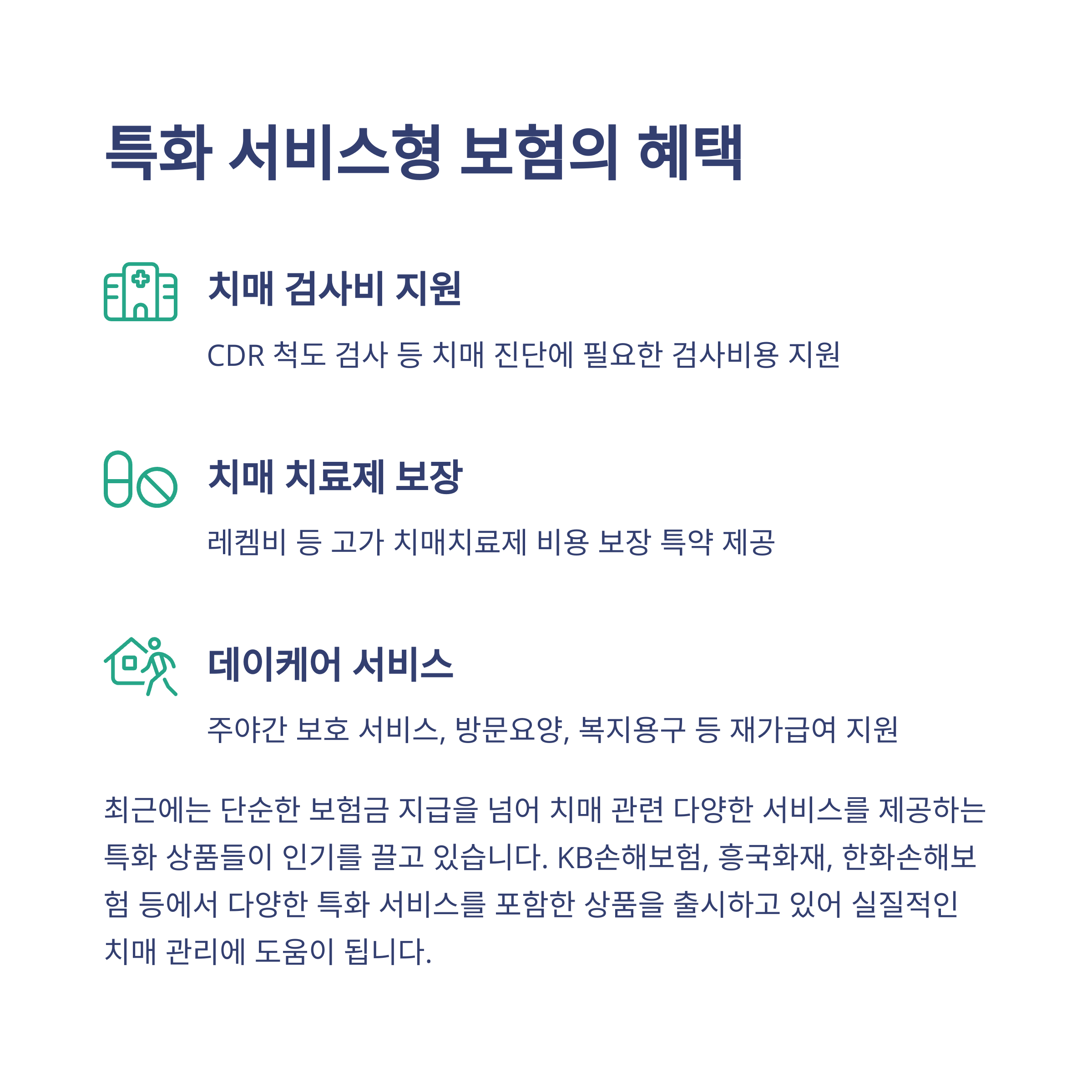 | 특화 서비스형 | 치매 검사, 치료제, 요양 서비스 보장 | 흥국화재, 한화손보 |