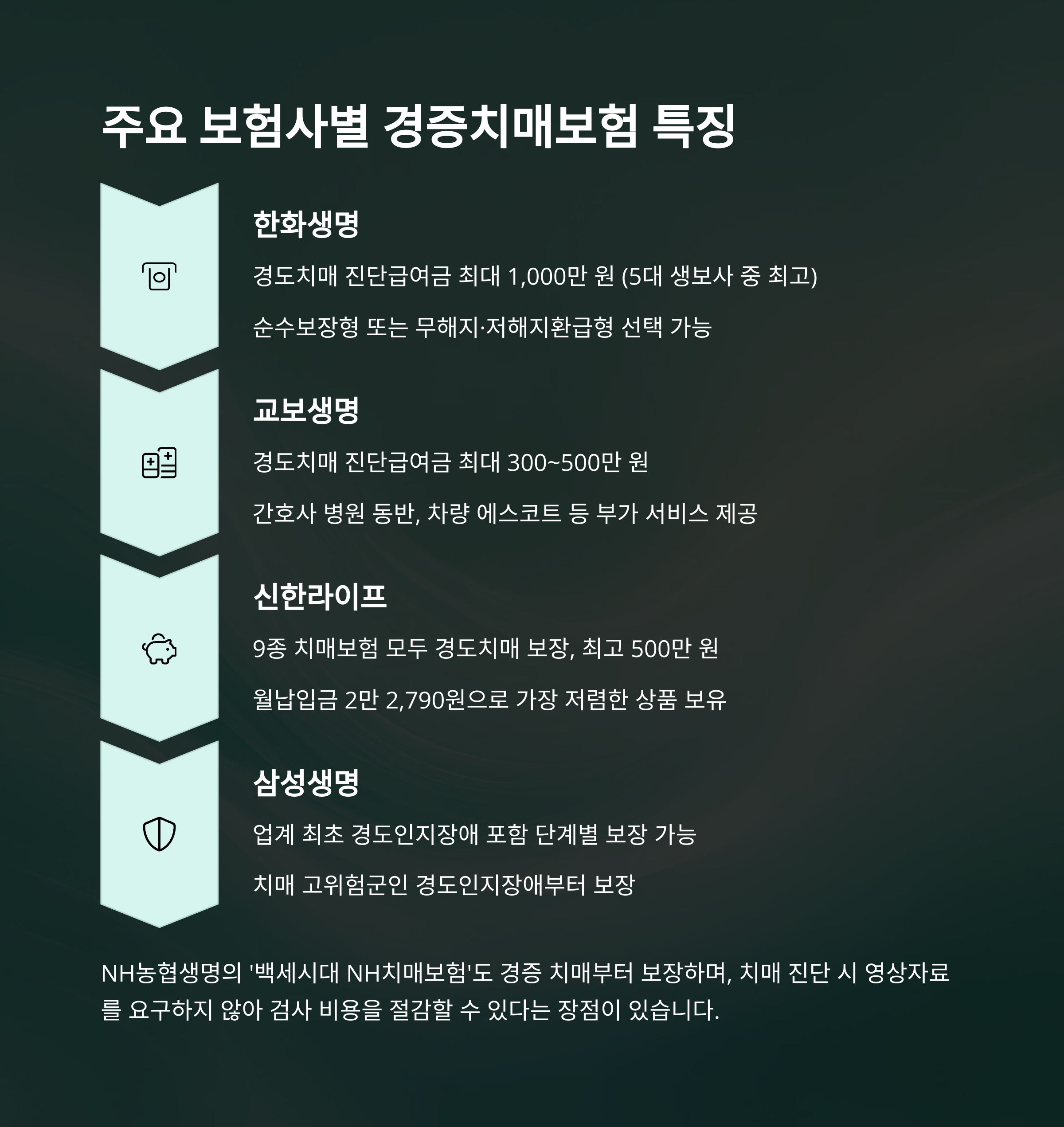| 한화생명 | 경도 치매 진단금 최대 1,000만 원, 무해지환급형 가능 |