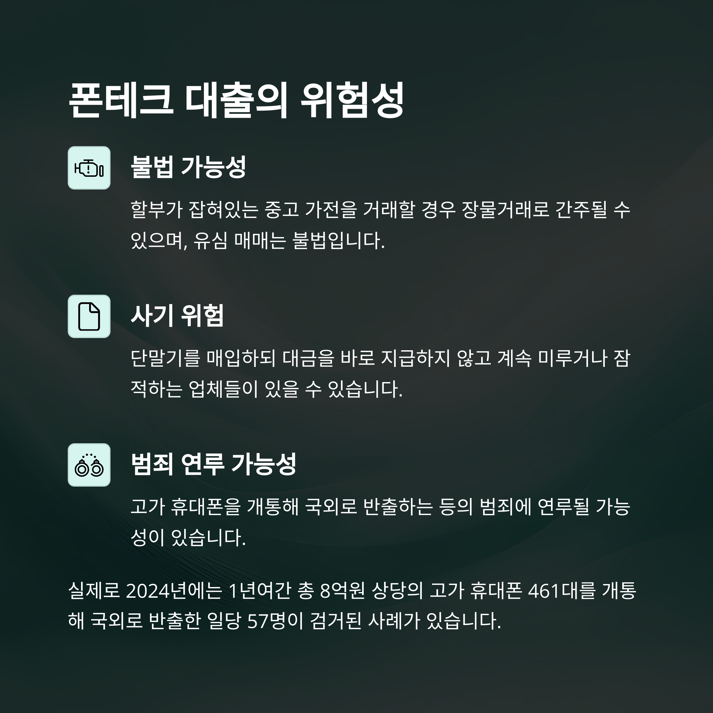 폰테크 대출은 잘만 이용하면 편리한 수단이지만, 아래와 같은 주의사항을 반드시 확인해야 합니다. 실제로 일부 사기 업체로 인해 피해 사례가 발생하고 있으니, 아래 내용을 꼼꼼히 읽어보세요.