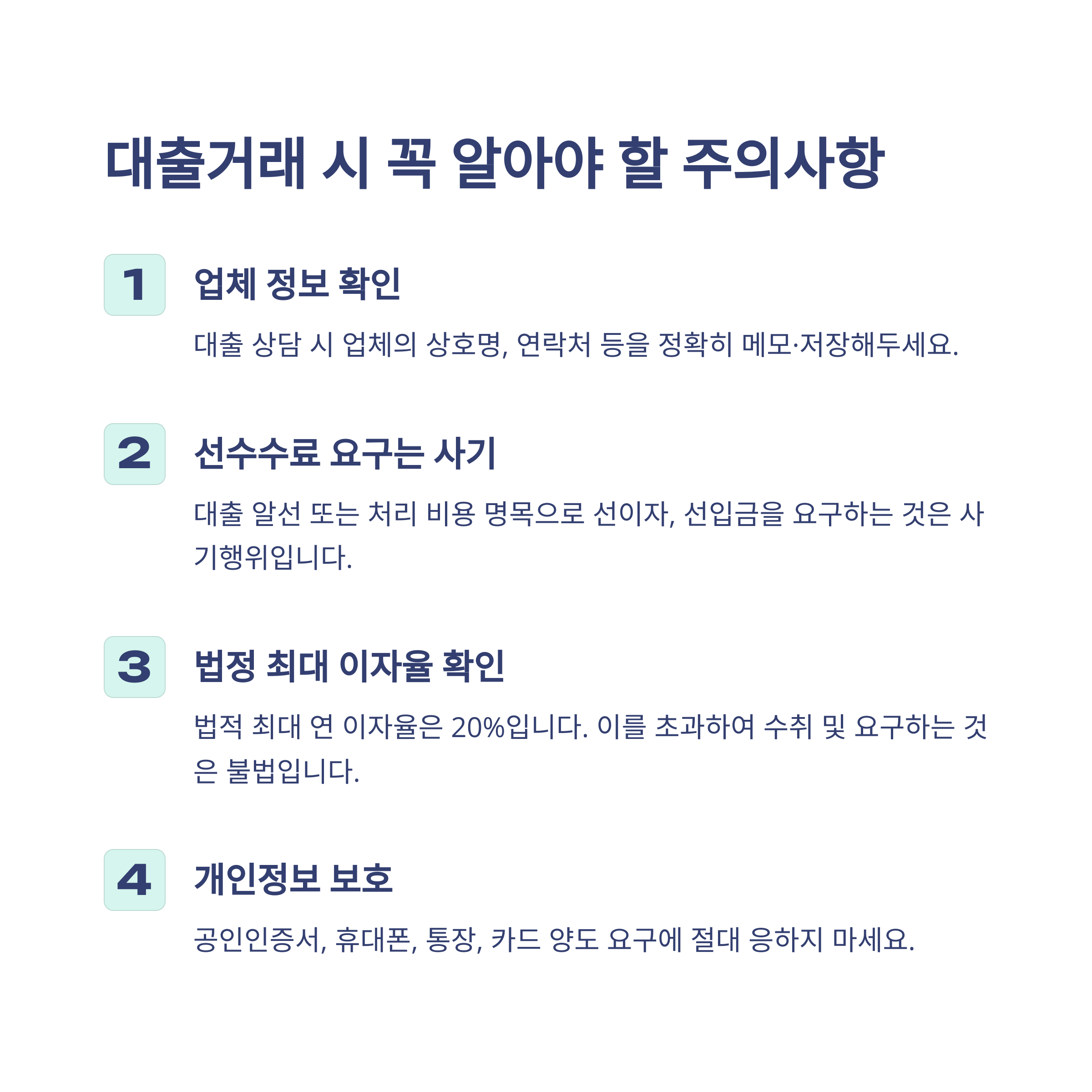 대출 플랫폼을 통해 연결되는 업체 중 일부는 미등록 대부업체일 수 있어요. 특히 '법정 최고금리'를 넘는 조건을 요구하는 곳은 불법 사금융입니다. 이런 사기는 단순히 금리만 높은 게 아니라, 선입금 요구나 신분증 요구 등 위험한 행동을 동반하니 정말 조심하셔야 해요.