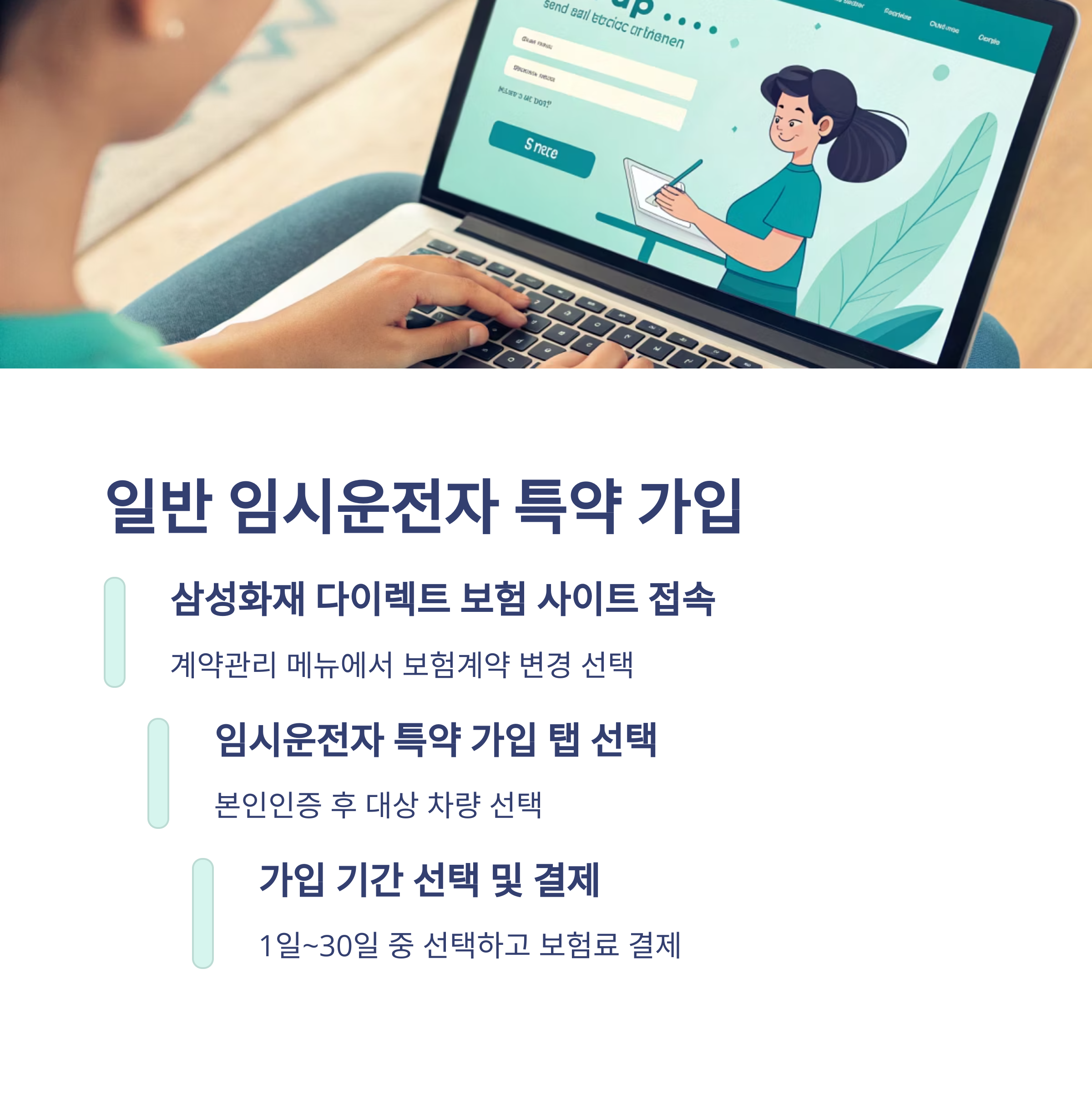 임시운전자 특약은 기존 내 자동차보험 보장을 그대로 따라갑니다. 운전자만 바뀌는 것이지, 보장 범위나 한도는 똑같이 유지되는 거죠. 반면, 원데이 보험은 삼성화재가 별도로 제공하는 단기 상품이라 보장 범위가 정해져 있어요.