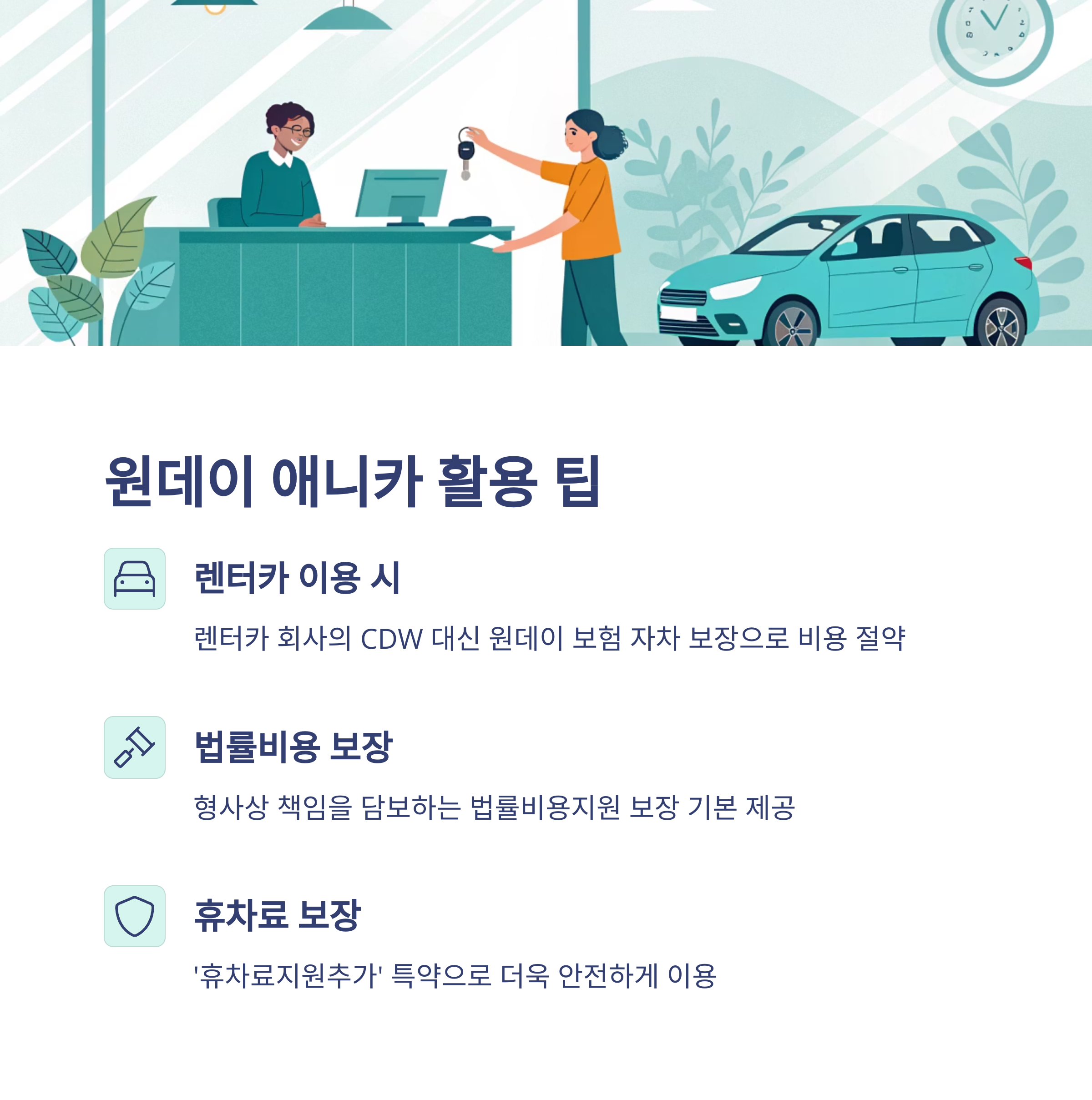 특히 원데이 보험은 기본 보장 외에도 형사상 책임에 대한 법률비용 지원까지 제공된다는 점이 눈에 띕니다. 렌터카 사고에 대한 걱정을 크게 덜 수 있죠.