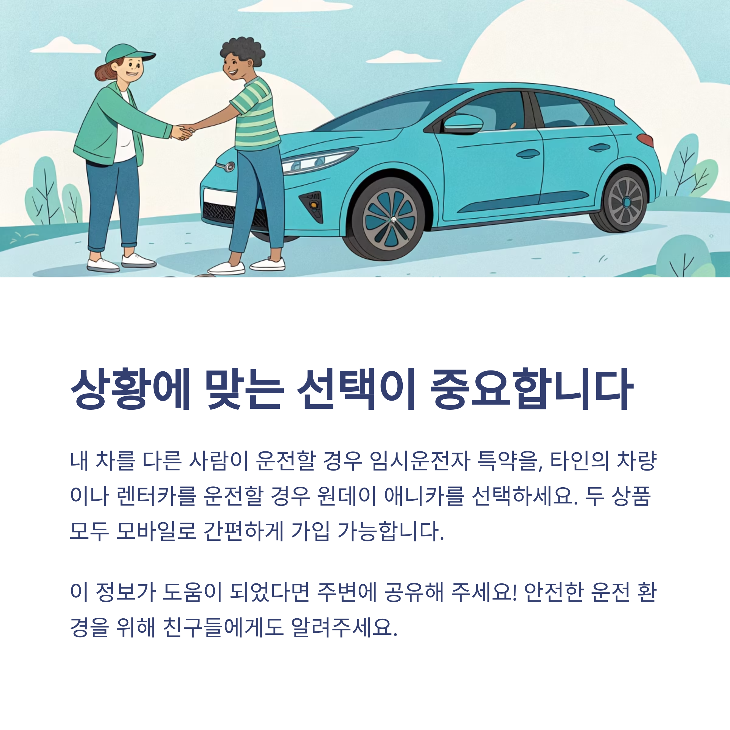 혹시 갑자기 다른 사람이 내 차를 몰아야 할 때, 또는 친구 차를 잠깐 운전해야 할 때, 어떤 보험을 들어야 할지 헷갈리셨던 적 있으신가요?