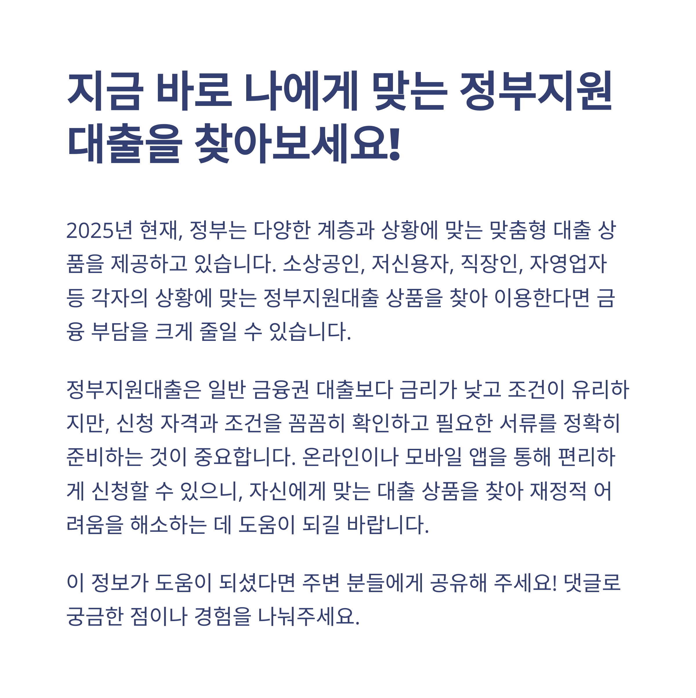 안녕하세요, 여러분! 얼마 전 친구가 자영업을 시작하면서 정부 대출을 받았다는 얘기를 들었어요. 그 얘기를 듣고 저도 한참 찾아봤는데, 생각보다 혜택이 많더라고요. 특히 2025년엔 지원 대상과 조건이 더 다양해졌더라고요. 그래서 저처럼 막막했던 분들을 위해, 정부지원대출 상품을 한눈에 정리해 드릴까 해요. 상황에 맞게 선택하고, 똑똑하게 신청할 수 있도록 도와드릴게요!