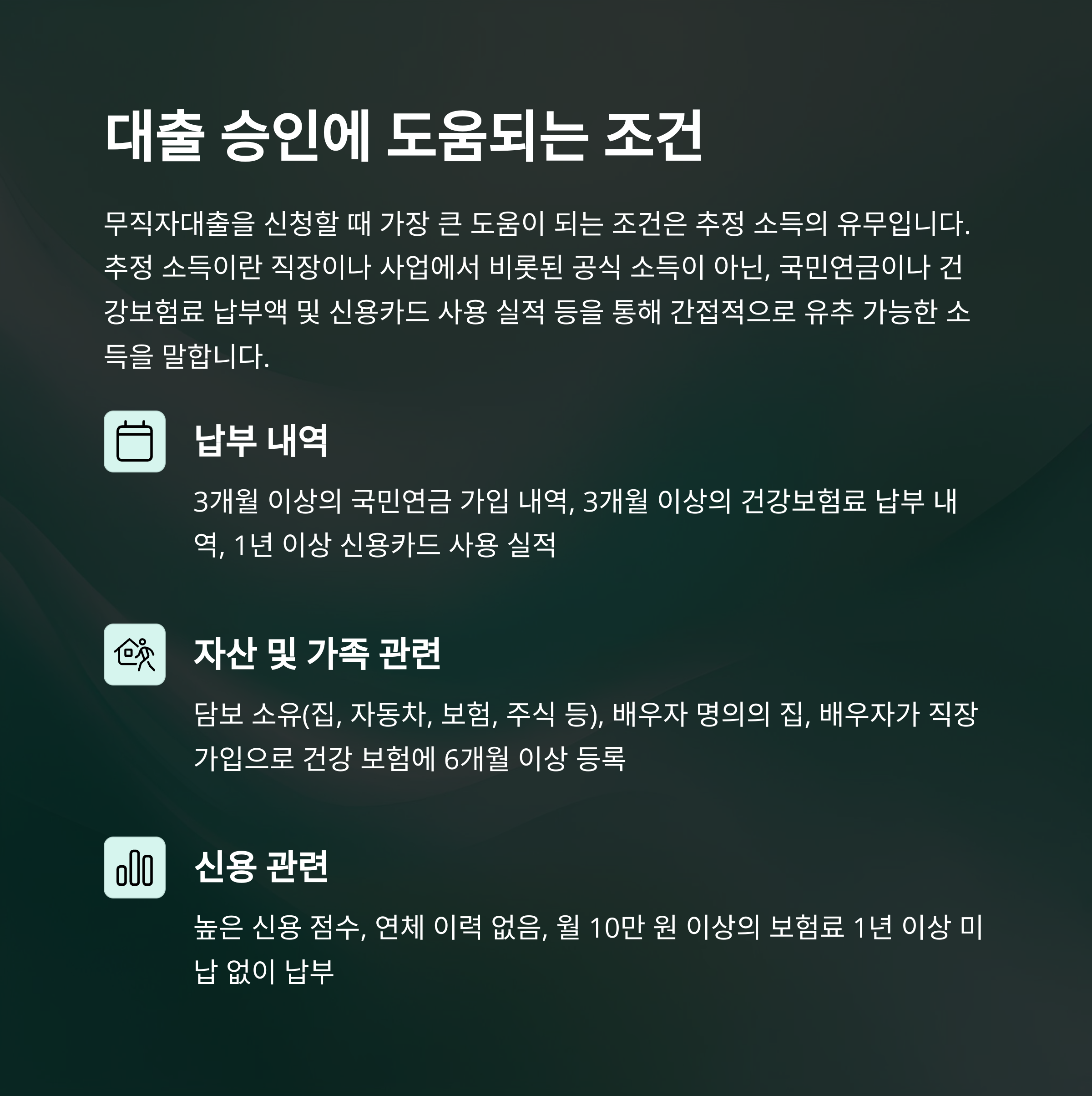 무직자라 하더라도 '추정 소득'이나 '경제활동 흔적'이 있다면 대출 승인이 훨씬 수월해질 수 있어요. 신용카드 사용 실적, 국민연금, 건강보험료 납부 이력 등이 모두 도움이 됩니다. 특히 이런 조건들이 갖춰져 있으면 금융기관 입장에서도 신뢰할 수 있는 고객으로 판단하거든요.