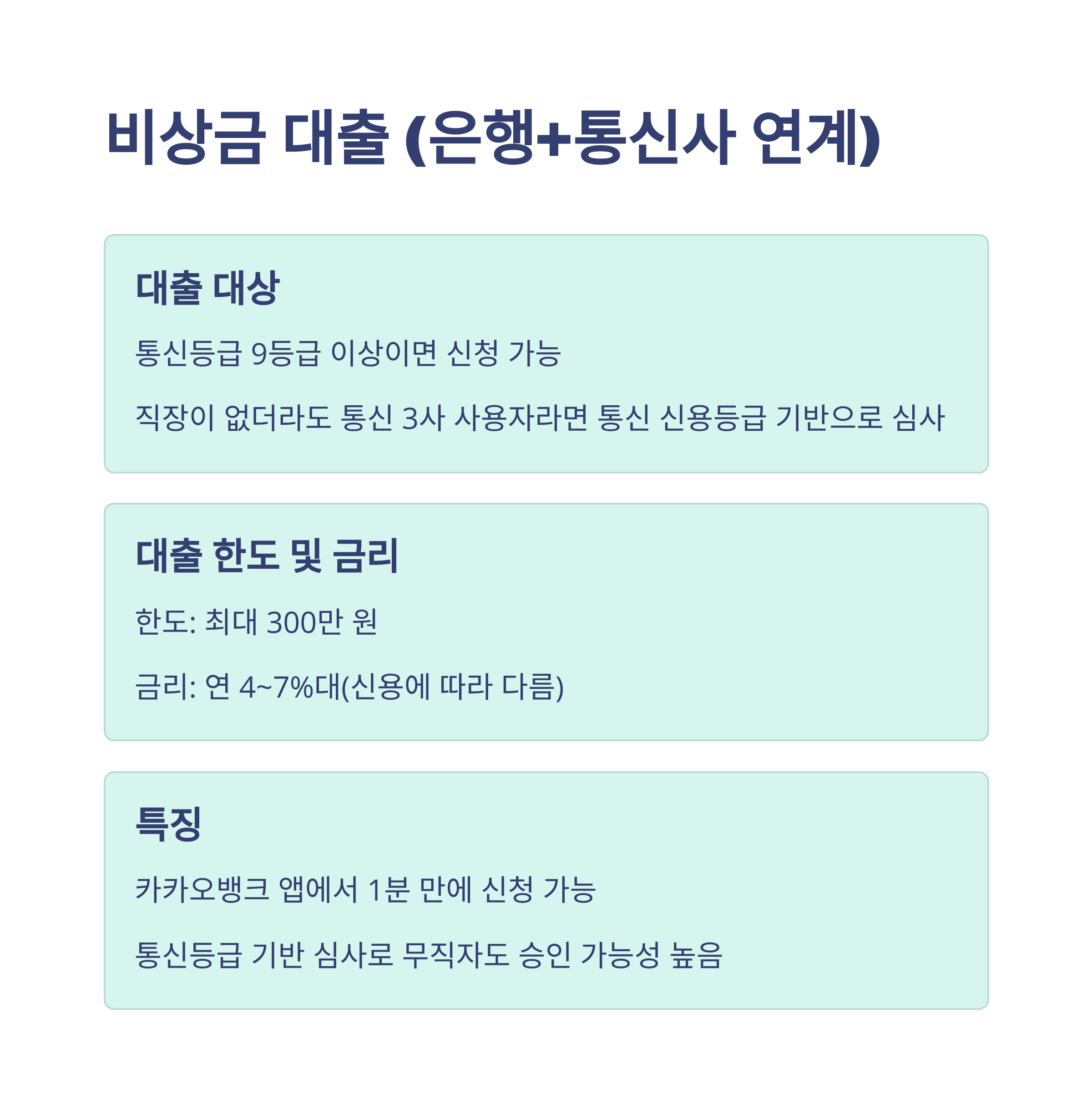 | 통신사 기반 비상금대출 | 통신등급 9등급 이상 | 최대 300만 원 / 연 4~7% |