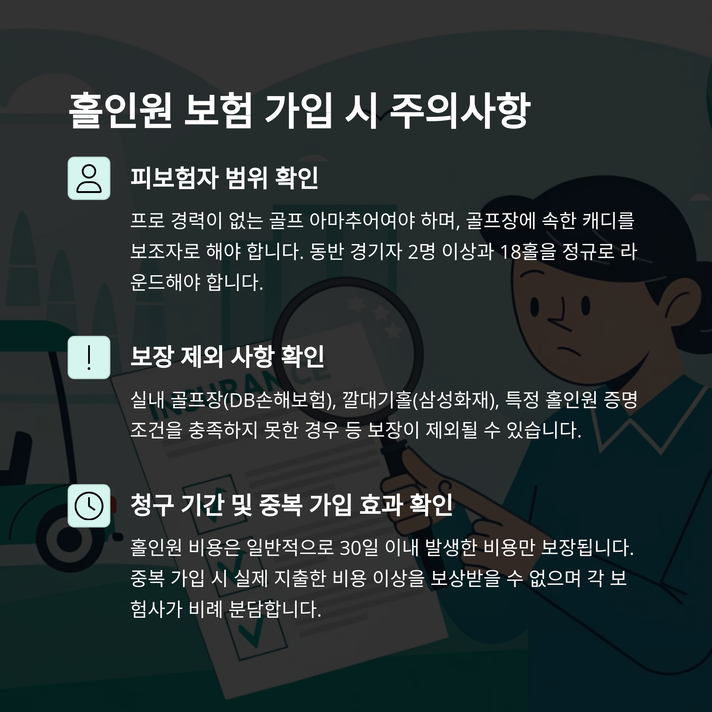 골프는 움직임이 많은 운동이다 보니 아무래도 다칠 위험이 있고, 또 예상치 못한 사고로 타인에게 피해를 줄 수도 있잖아요. 저도 가끔 동반자에게 공 날아갈까 봐 조마조마할 때가 있어요. 홀인원 보험은 이런 부분까지 꼼꼼하게 챙겨줍니다!