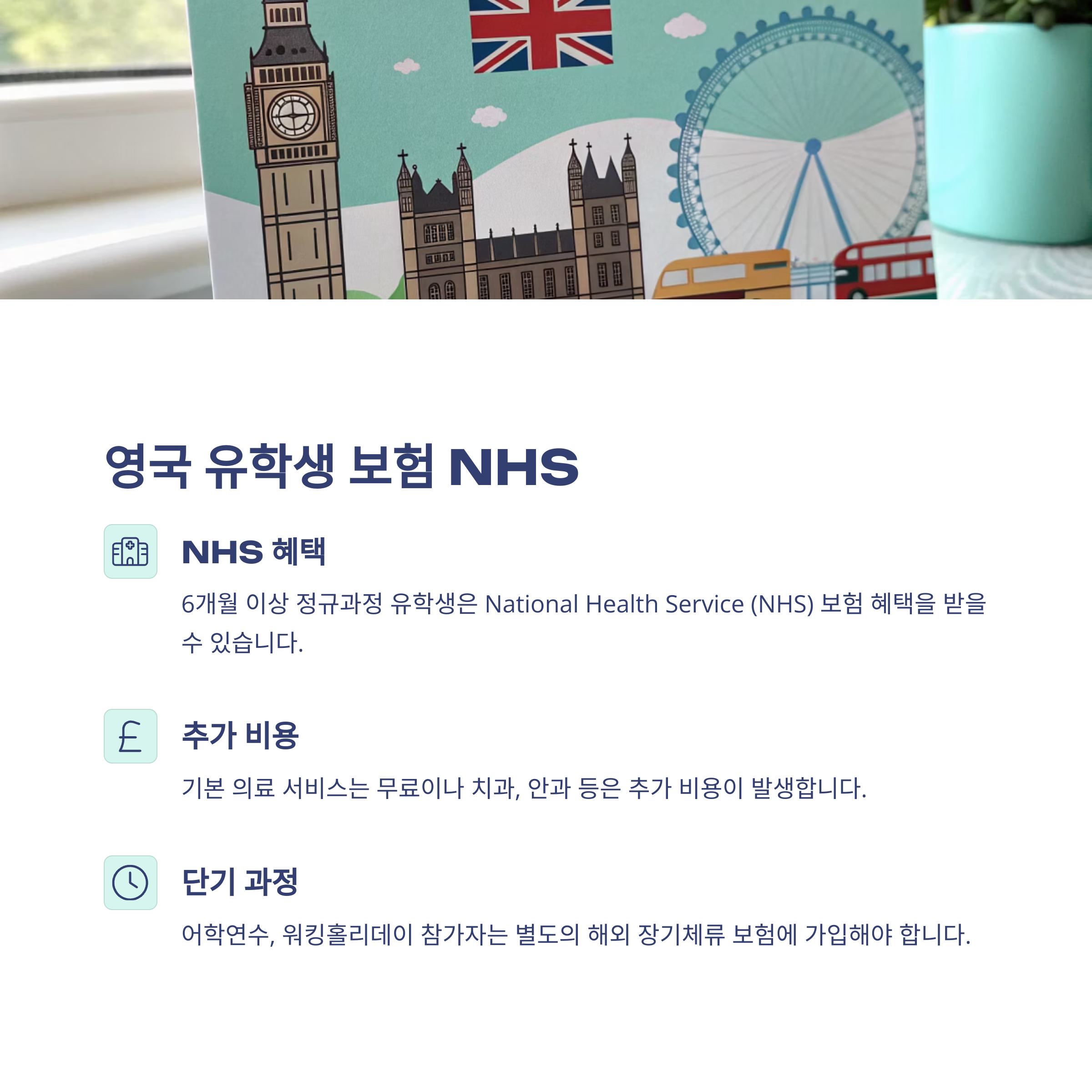 | 영국 | 정규과정 유학생 NHS 혜택, 단기 과정은 사설 보험 필요 | NHS (National Health Service), 사설 보험 | NHS: 무료 (추가 비용 발생 가능), 사설 보험: 연간 수십만 원 |