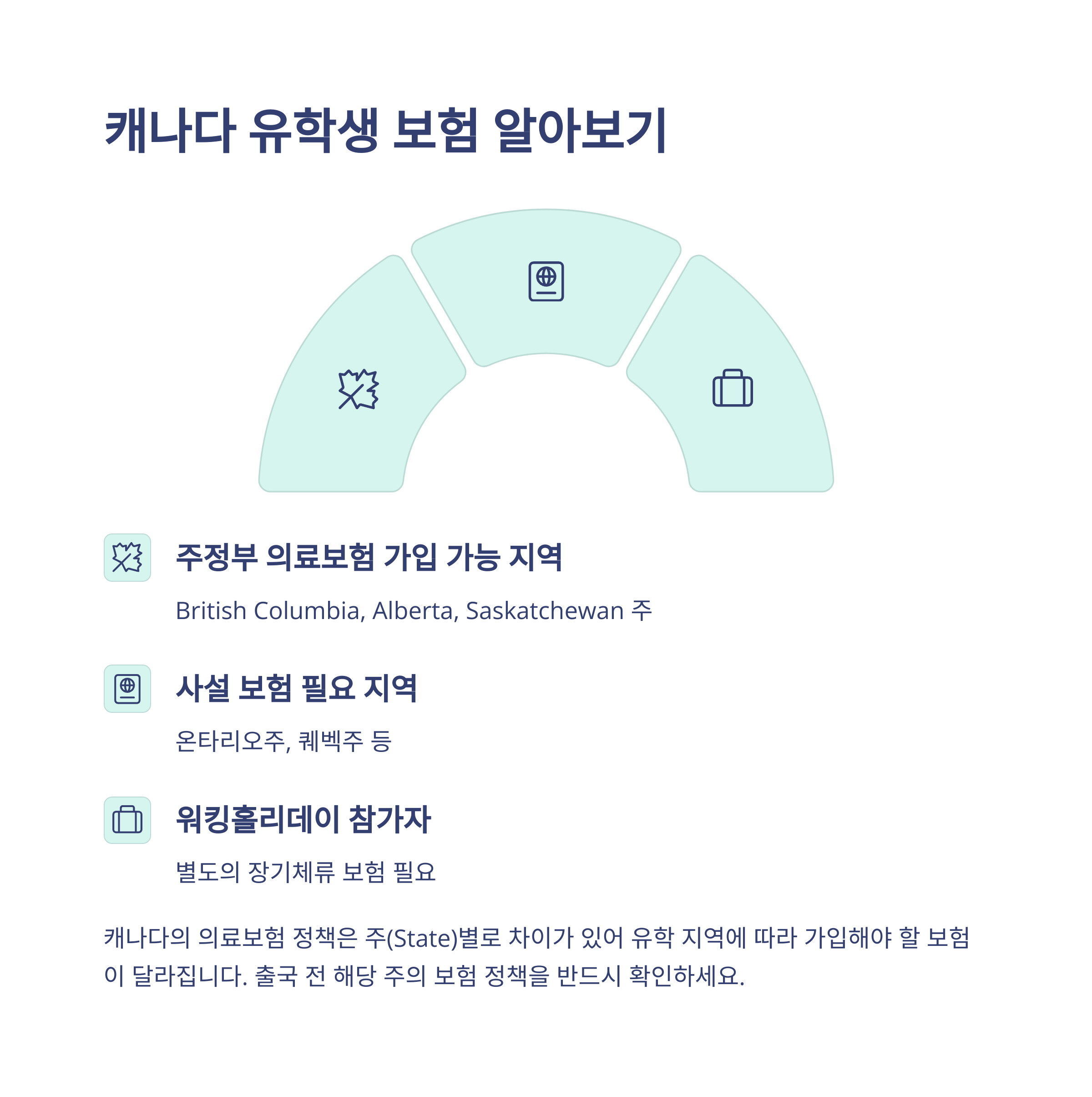 | 캐나다 | 주(State)별 정책 상이 (주정부 의료보험 또는 사설 보험) | BC주, 알버타주, 서스캐처원주: 주정부 의료보험, 기타 주: 사설 보험 | 주별 상이 (사설 보험은 연간 수십만 원) |