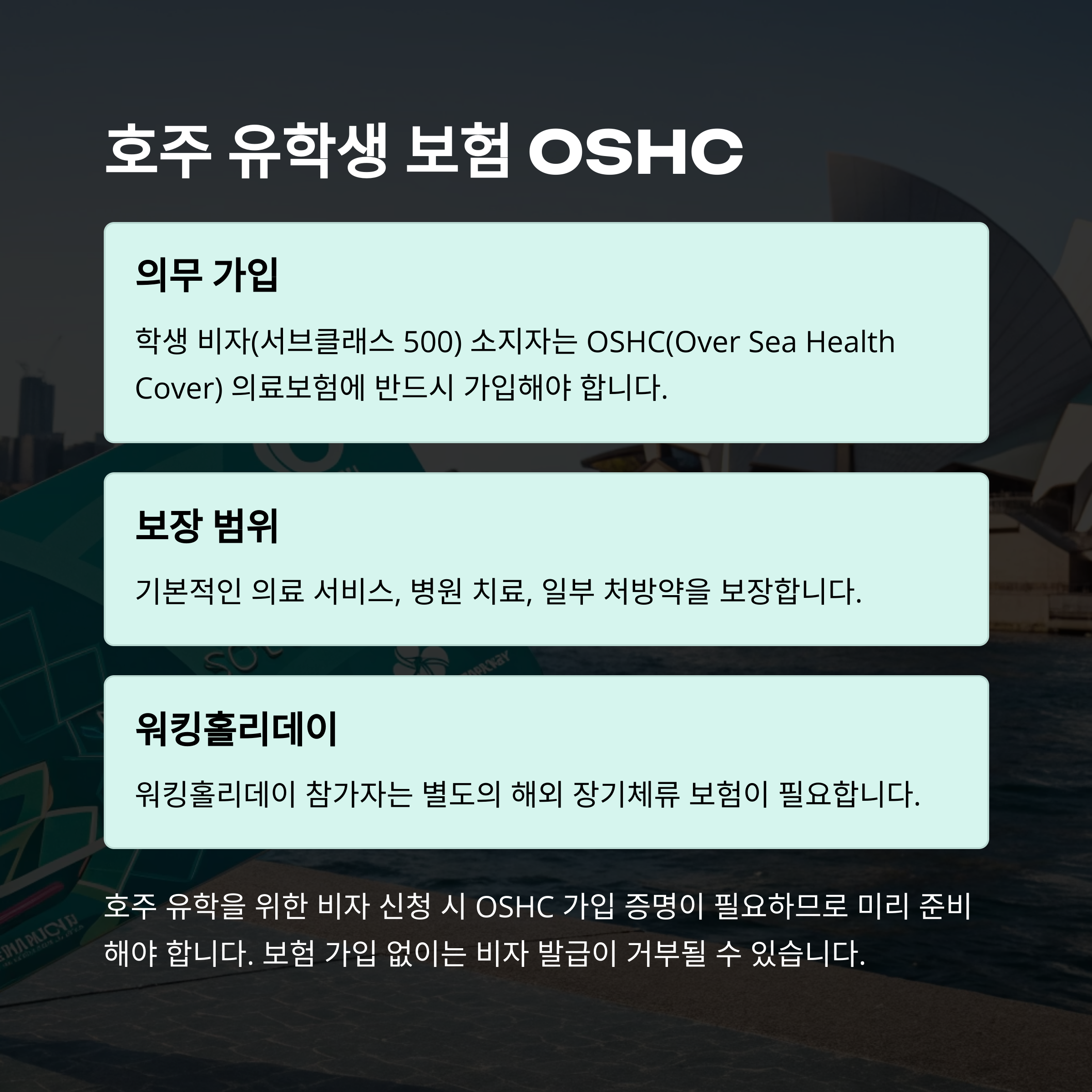 | 호주 | 학생 비자(500) 소지자 OSHC 의무 가입 | OSHC (Overseas Student Health Cover) | 연간 약 50만 원 내외 (개인 플랜 기준) |