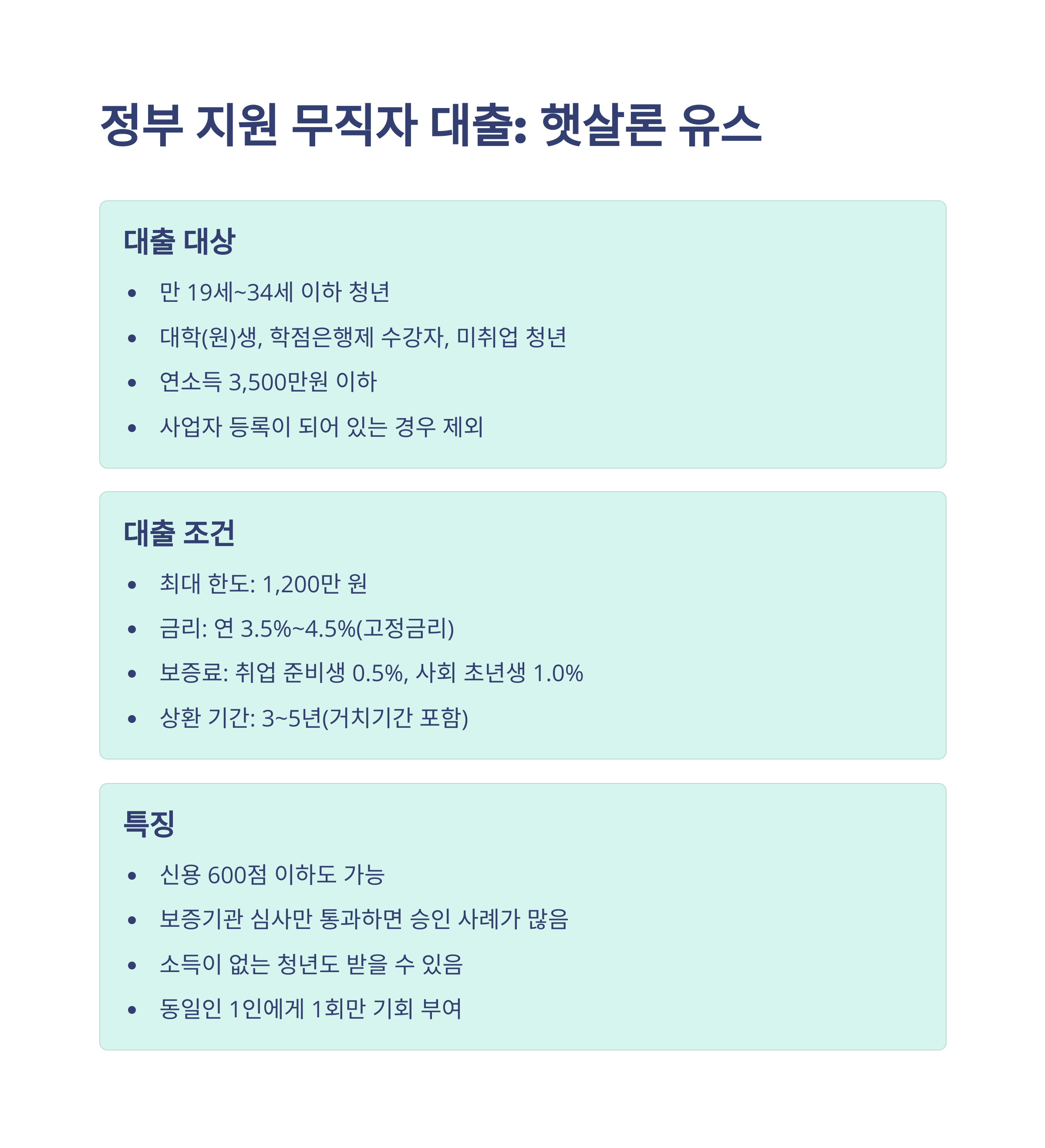 - 특징: 신용 점수가 600점 이하인 분들도 신청할 수 있다는 게 정말 큰 장점이죠! 보증기관의 심사만 통과하면 실제로 승인 사례가 많다고 합니다. 정부 지원 정책 자금이라 소득이 없는 청년들도 도움을 받을 수 있는 희망 같은 존재예요. 다만, 동일인에게는 1회만 기회가 주어지니(한도 내에서 여러 번 나눠 받을 수는 있지만, 모두 상환 후에도 재신청은 불가) 신중하게 계획해서 신청해야 해요. 자세한 내용은 서민금융진흥원 햇살론 유스 페이지(www.kinfa.or.kr/financialProduct/hessalLoanYouth.do)를 참고하세요.