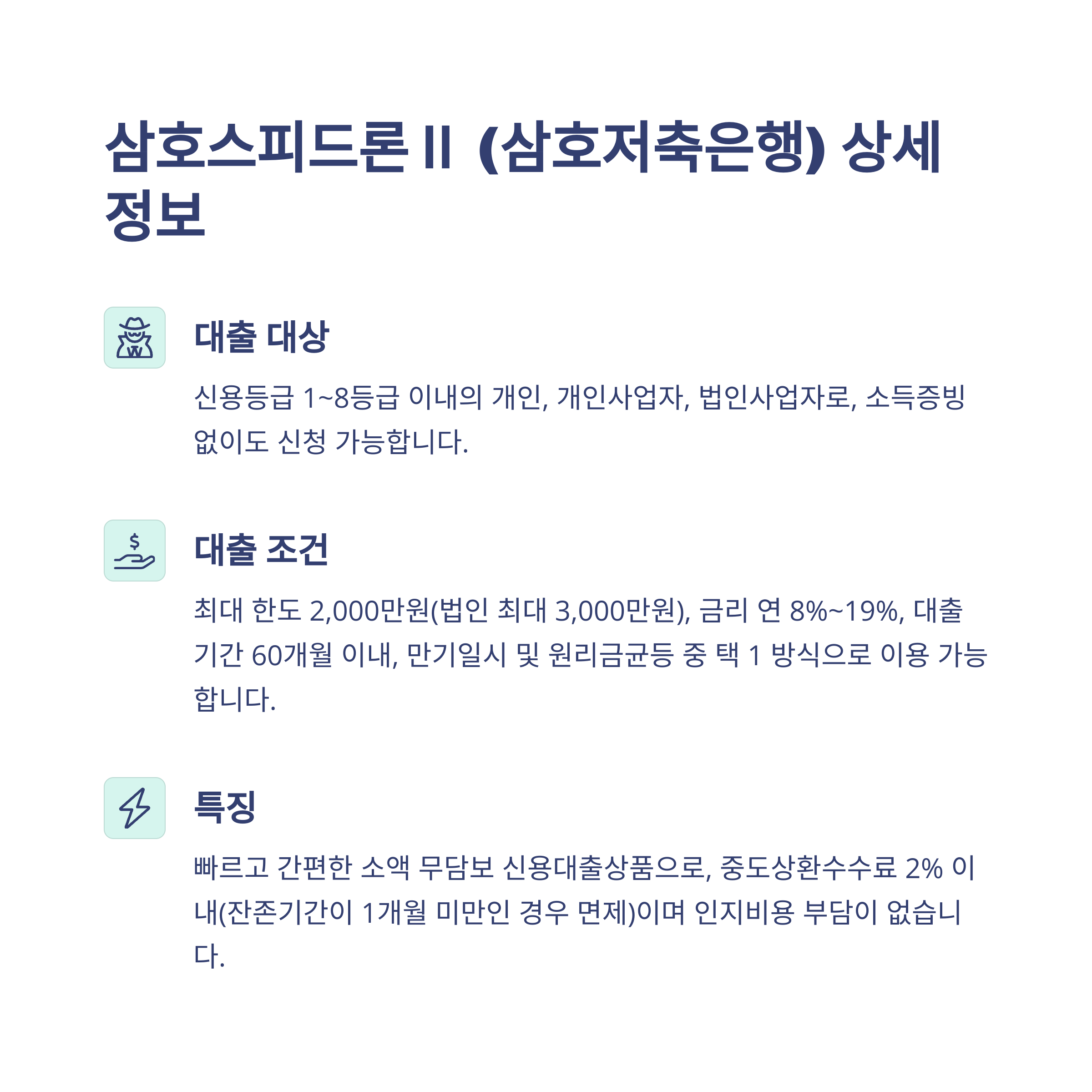 - 특징: 고정금리가 적용되어 이자 부담을 예측하기 쉽고, 취급수수료가 없다는 점이 장점입니다. 중도상환수수료는 중도상환금액의 1.7% 이내지만, 대출취급일로부터 3년이 경과하면 중도상환수수료가 면제되니 참고하세요. 필요 서류는 신분증, 주민등록초본, 건강보험서류 등이 있습니다. 모아저축은행 홈페이지(www.moasb.co.kr)에서 더 자세한 내용을 확인해보세요.
