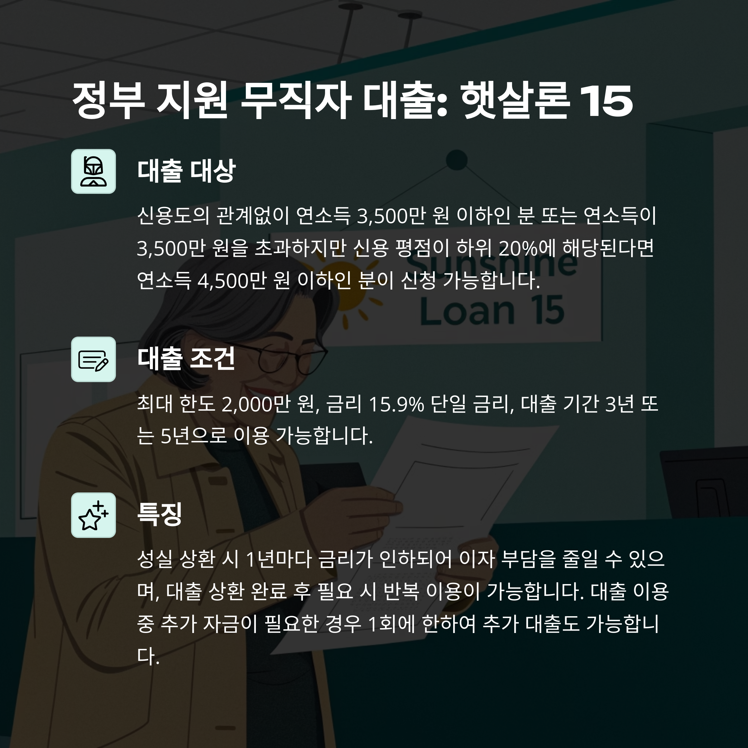 - 특징: 성실하게 상환하면 1년마다 금리가 인하되어 이자 부담을 줄일 수 있다는 점이 매력적이에요. 대출 상환 완료 후 필요하다면 반복 이용도 가능하고, 대출 이용 중 추가 자금이 필요한 경우 1회에 한하여 추가 대출도 가능합니다. 궁금한 점이 있다면 국번 없이 1397로 문의해보세요. 서민금융진흥원 햇살론15 페이지(www.kinfa.or.kr/financialProduct/hessalLoan15.do)에서도 더 자세한 정보를 확인할 수 있습니다.