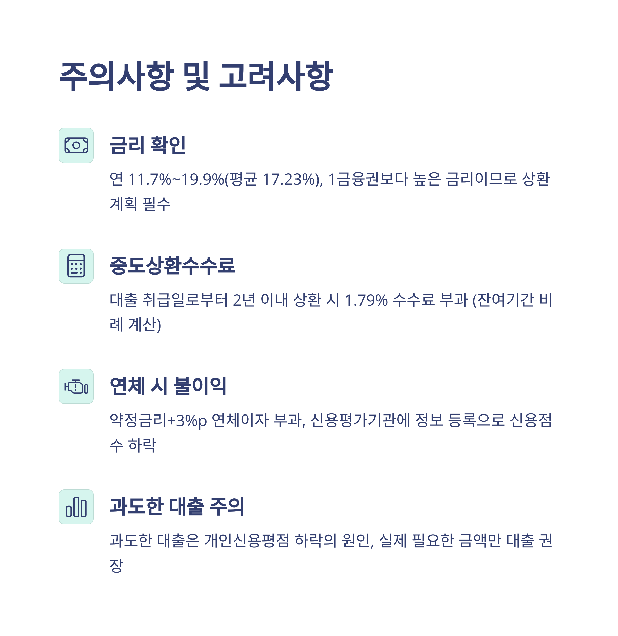 또 하나 중요한 건 중도상환수수료예요. 대출받고 2년 안에 상환하면 1.79%의 수수료가 붙는다고 하니, 혹시나 여유 자금이 생겨서 일찍 갚고 싶을 때는 이 수수료를 고려해야 해요. 저는 개인적으로 대출은 빨리 갚는 게 최고라고 생각하는데, 이 수수료 때문에 고민이 좀 될 수도 있겠죠. 연체 시 불이익은 두말하면 잔소리겠죠? 약정금리에 3%p가 추가된 연체이자가 붙고, 신용점수도 뚝뚝 떨어진다고 하니, 절대 연체하지 않도록 조심해야 합니다. 저도 한 번 신용점수 떨어져서 고생했던 기억이 있어서, 이런 점은 특히 민감하게 받아들여져요.