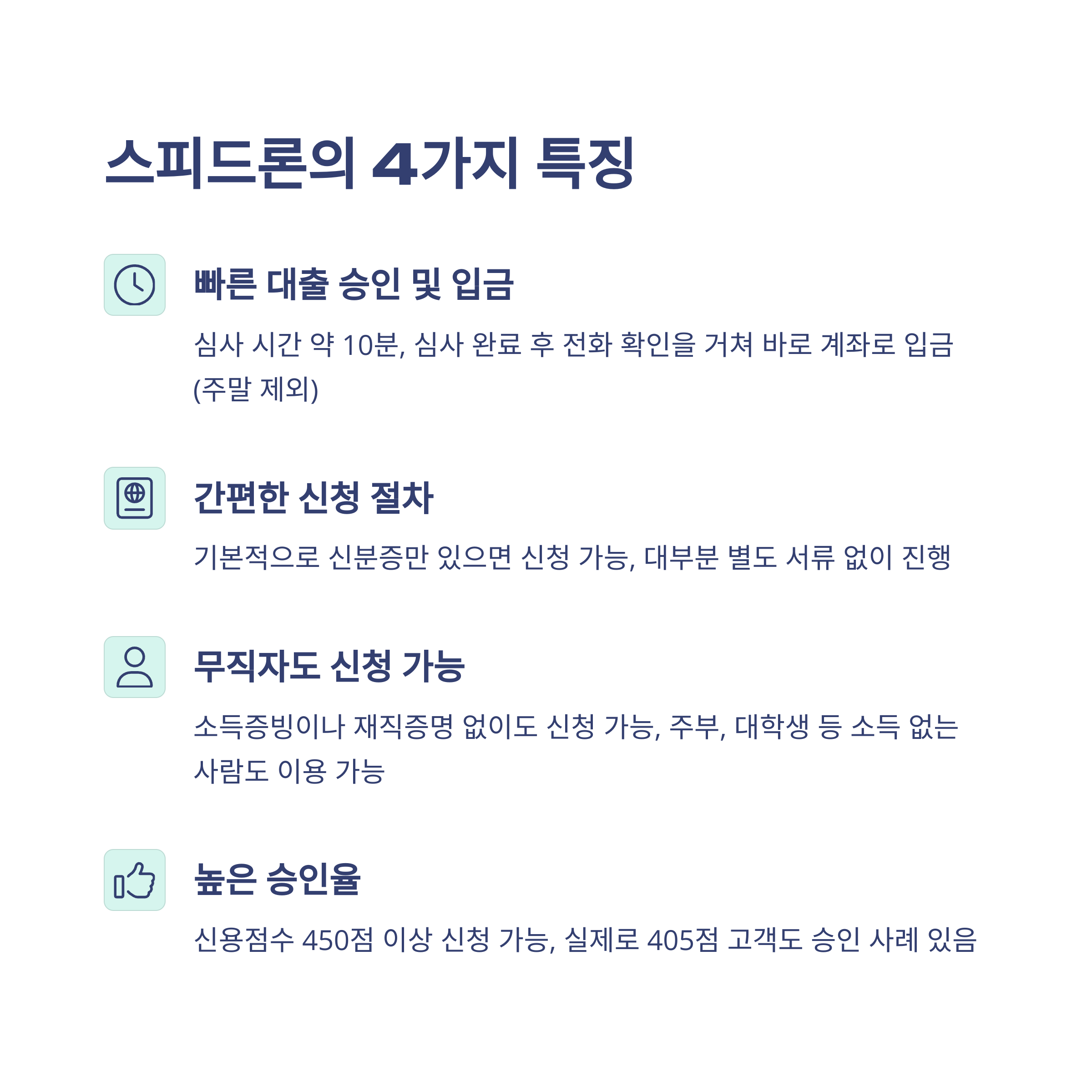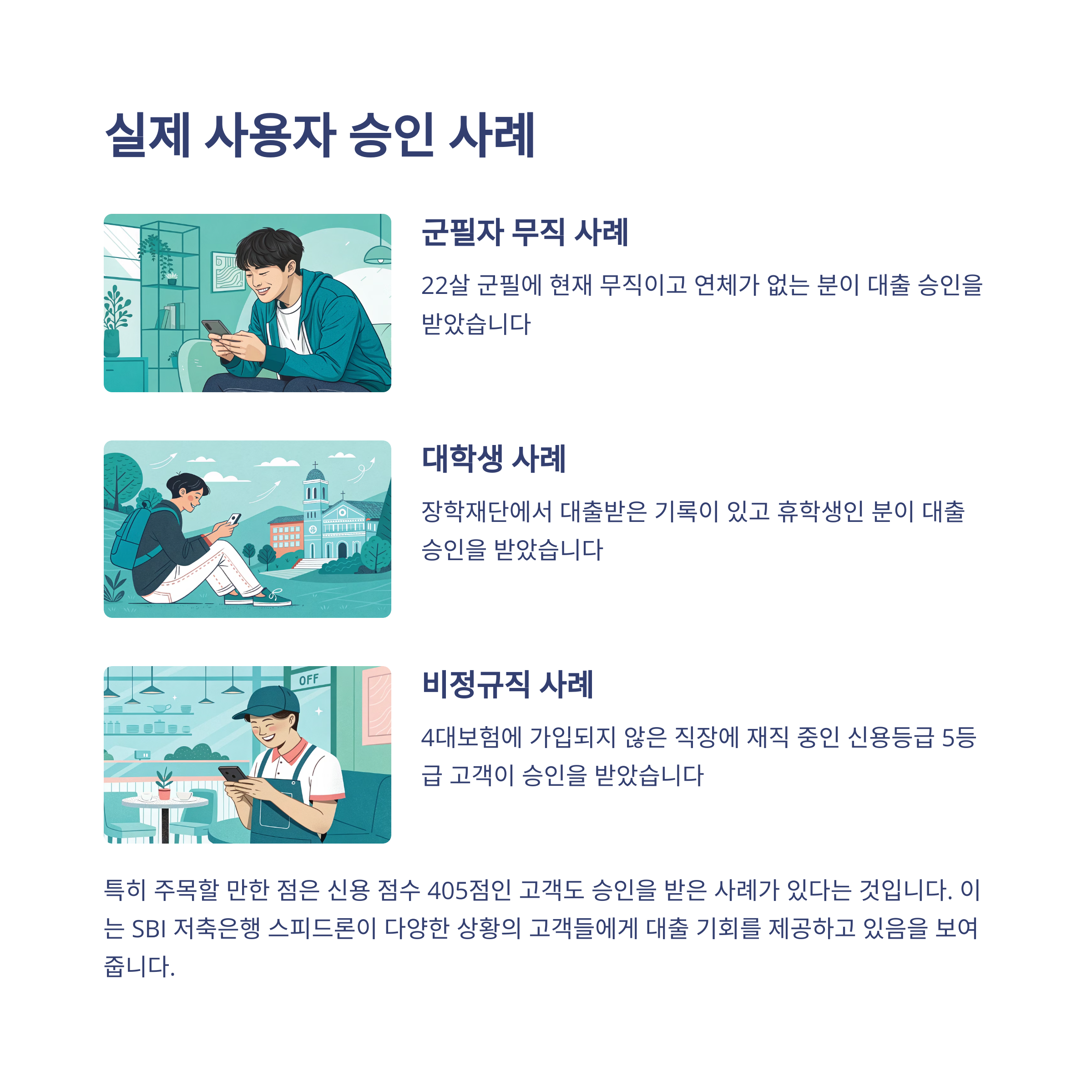 - 대학생 사례: 장학재단에서 대출받은 기록이 있는 휴학생이 스피드론 승인을 받았다는 얘기도 있어요. 저도 대학생 때 급전이 필요했던 적이 많았는데, 그때 이런 상품이 있었다면 정말 좋았을 것 같다는 생각이 들었네요.