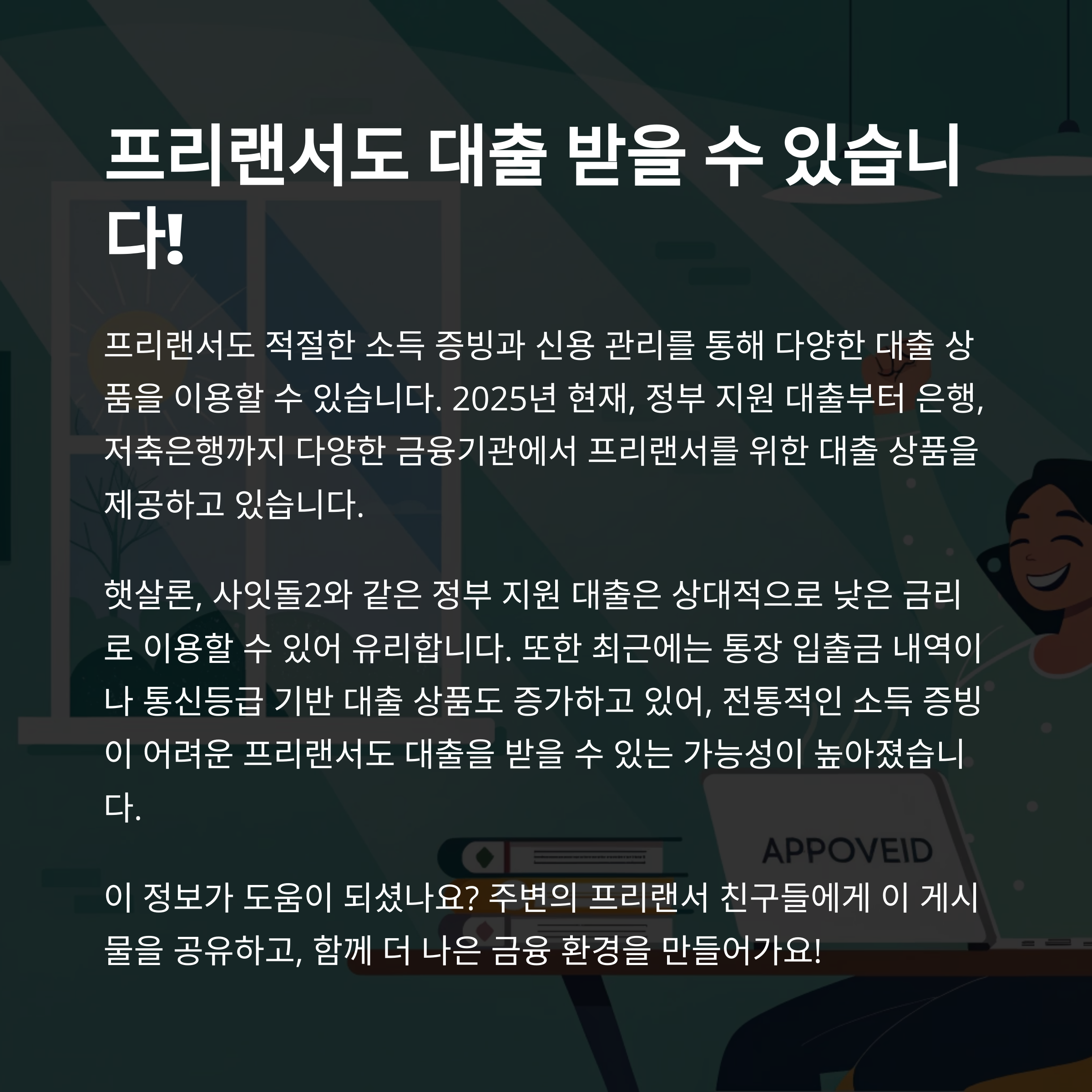 태그: 프리랜서대출, 2025년대출, 프리랜서소득증빙, 정부지원대출, 햇살론, 사잇돌2, 전세자금대출, 개인사업자대출, 신용관리, 금융정보