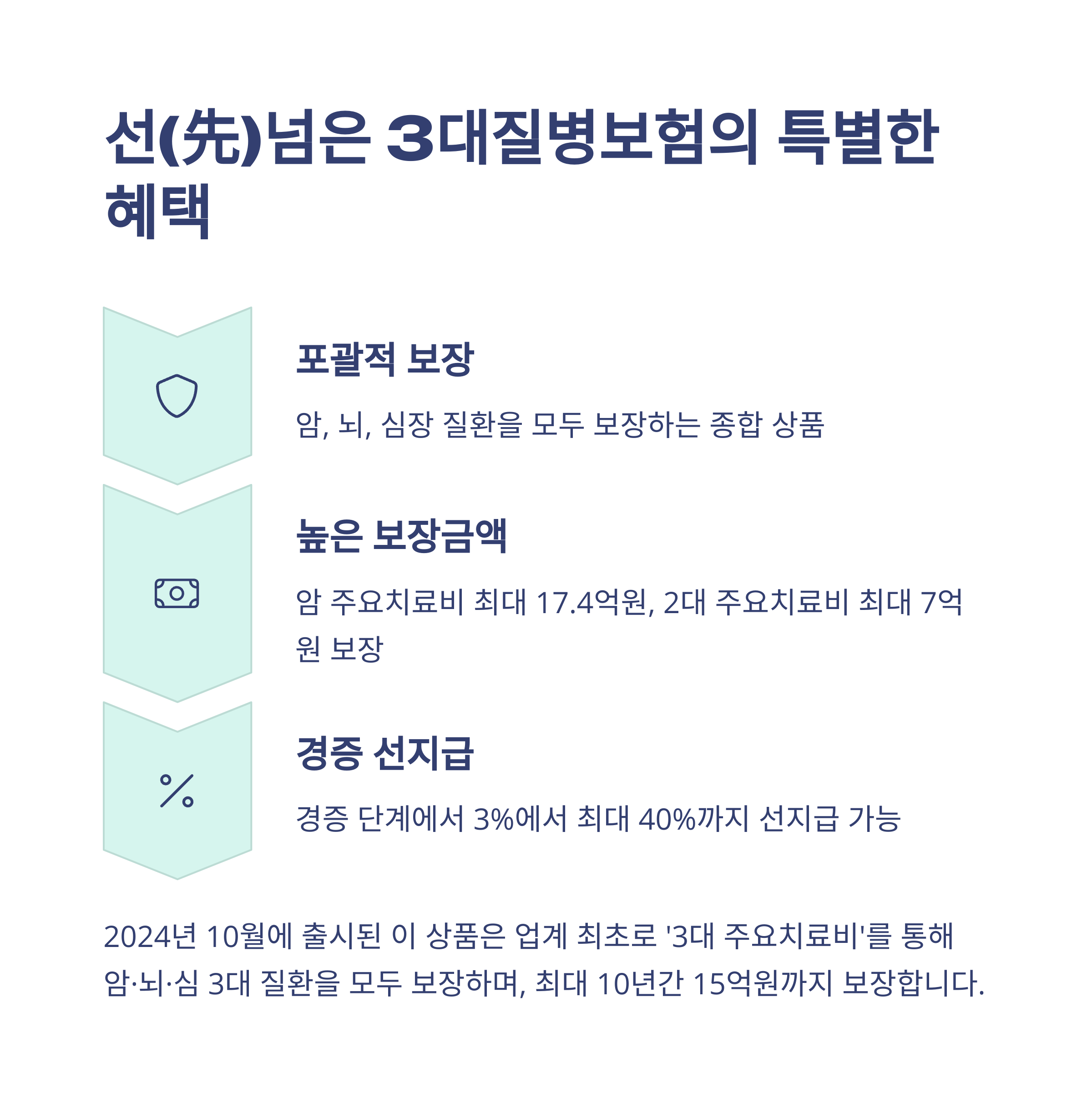 - • 선(先)넘은 3대질병보험: 이건 2024년 10월에 새로 나온 따끈따끈한 상품인데, 암뿐만 아니라 뇌, 심장 질환까지 한 번에 보장해줘요. 특히 '업계 누적 프리패스 플랜', '고고당 플랜' 같은 이름이 붙은 다양한 특화 플랜들이 있어서 저 같은 평범한 사람이 봐도 '어? 이건 뭔가 다르다!' 싶었어요. 경증 단계에서도 진단비의 일부를 선지급받을 수 있다는 점이 정말 혁신적이라고 느꼈습니다. 암 주요치료비는 10년간 최대 17.4억 원, 2대 주요치료비는 10년간 최대 7억 원까지 보장된다고 하니, 정말 든든하죠?