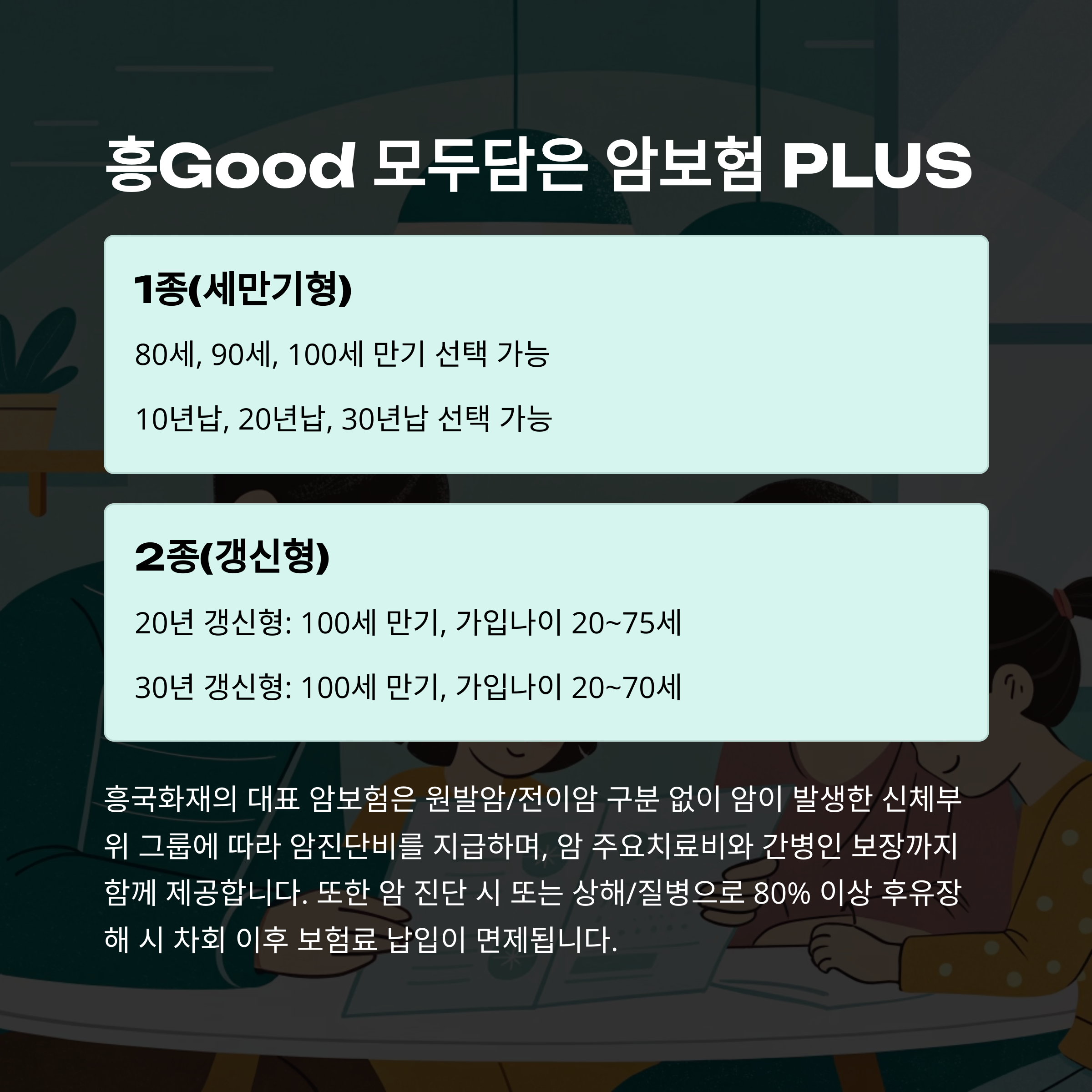 - • 흥Good 모두담은 암보험 PLUS: 이름처럼 암 관련 모든 것을 담으려는 노력이 돋보이는 상품이에요. 저는 특히 '원발암/전이암 구분 없이 암 진단비 지급'이라는 문구에 눈길이 확 갔어요. 이게 진짜 중요한 부분이거든요! 암이 처음 생긴 부위뿐만 아니라 다른 곳으로 전이되더라도 암이 발생한 신체 부위 그룹에 따라 최대 8번까지 진단비를 받을 수 있다니, 정말 든든하죠? 세만기형(80, 90, 100세 만기)과 갱신형(20년, 30년 갱신) 중 선택할 수 있어서 저처럼 장기적인 보장을 원하는 사람에게도, 합리적인 보험료로 시작하고 싶은 사람에게도 다 맞출 수 있겠더라고요. 암(유사암제외) 진단 시 보험료 납입면제 혜택도 있어서 부담을 덜 수 있다는 점도 좋았습니다.