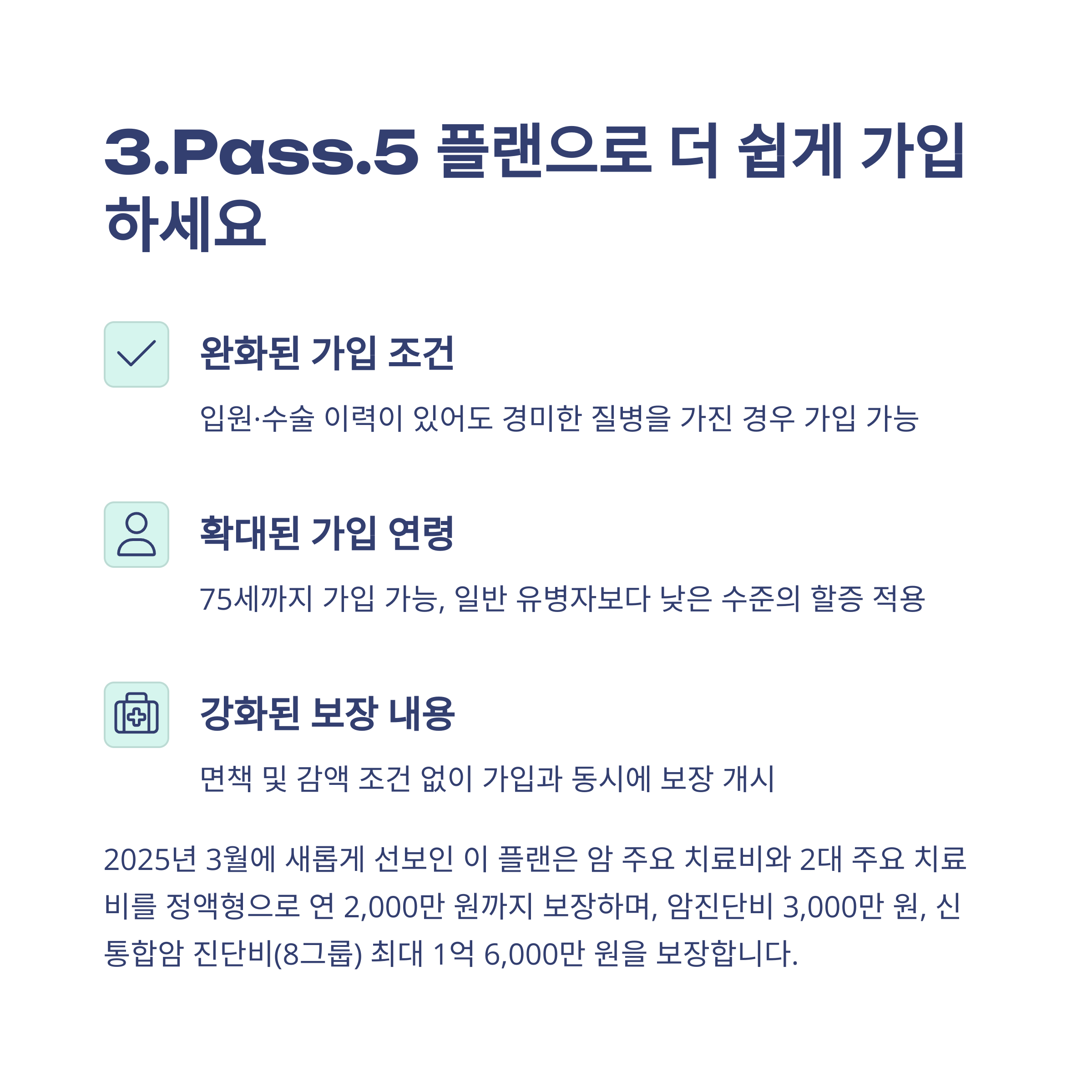 - • 3.Pass.5 플랜: 이 플랜은 2025년 3월에 나온 최신 상품인데, 입원이나 수술 이력이 있는 유병자분들도 가입할 수 있다는 점이 정말 큰 장점이에요! 저처럼 건강이 100% 좋지 않은 사람도 암보험을 준비할 수 있다는 게 얼마나 큰 위안인지 몰라요. 게다가 일반 유병자보다 낮은 할증을 적용해서 보험료 부담도 덜어줬더라고요. 최대 75세까지 가입 연령이 확대되고, 암 주요치료비와 2대 주요치료비도 정액형으로 연 2,000만 원까지 보장해준다고 합니다. 면책 및 감액 조건 없이 가입과 동시에 보장이 개시된다니, 정말 파격적이죠?