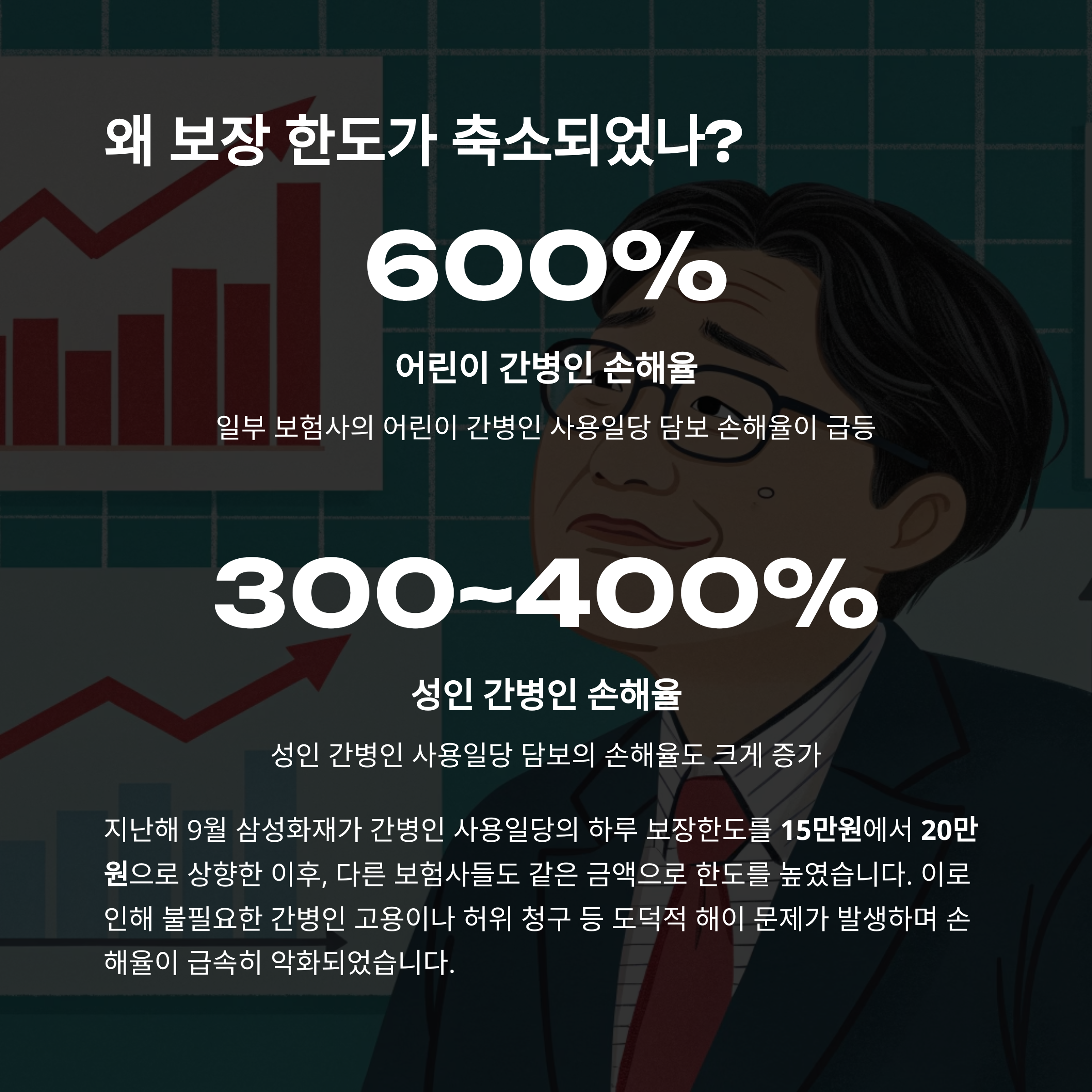 보험사들의 손해율 악화가 주된 원인입니다. 간병비 보험 판매 경쟁으로 보장 한도가 오르자 불필요한 간병인 고용이나 허위 청구 사례가 늘어나, 일부 보험사의 어린이 간병인 사용일당 손해율이 600%까지 급등했기 때문입니다.