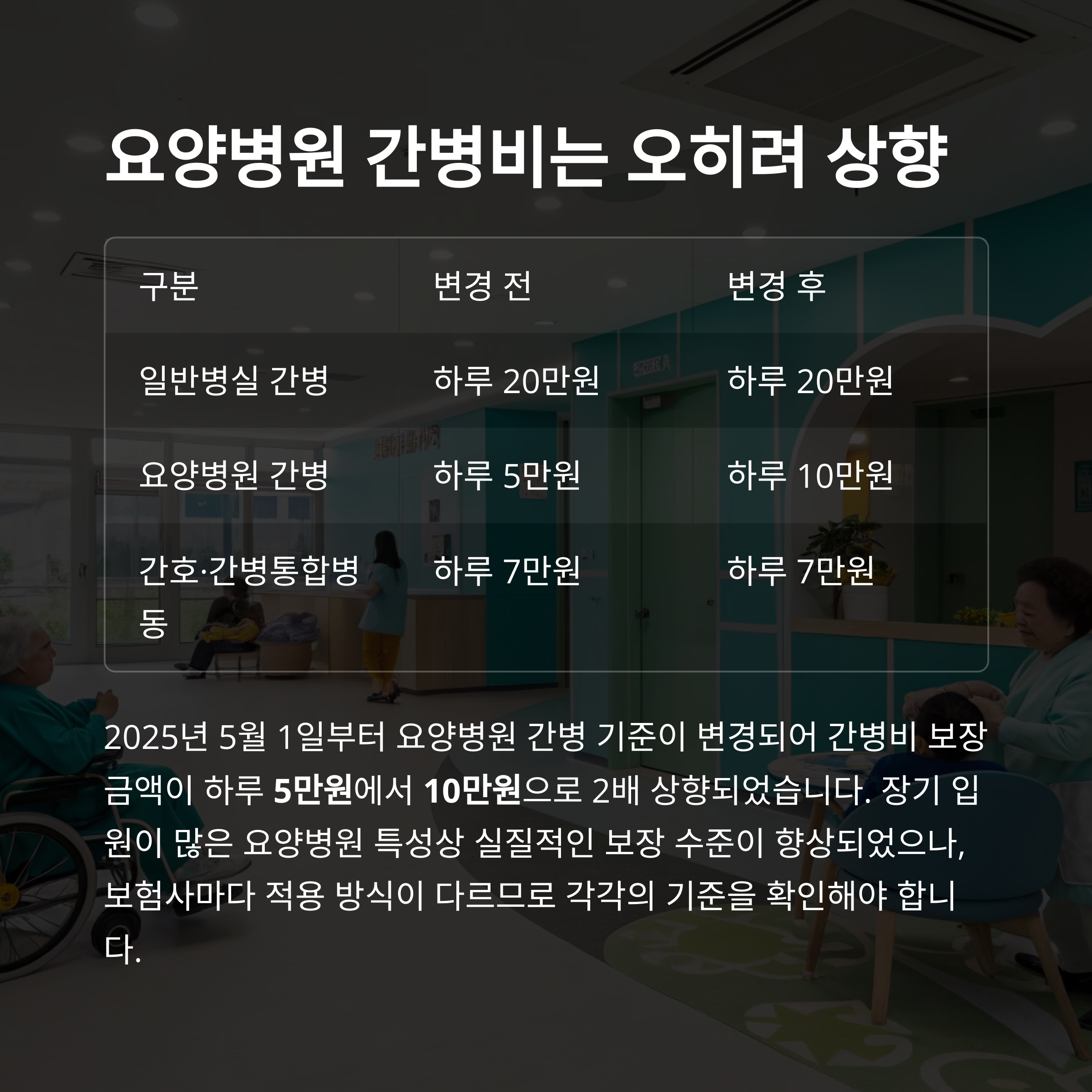 2025년 5월 1일부터 요양병원 간병 기준이 변경되면서, 장기 입원이 많은 요양병원의 특성을 반영하여 간병비 보장금액이 하루 5만원에서 10만원으로 2배 상향 조정되었습니다. 이는 실질적인 환자 부담 경감을 위한 조치입니다.