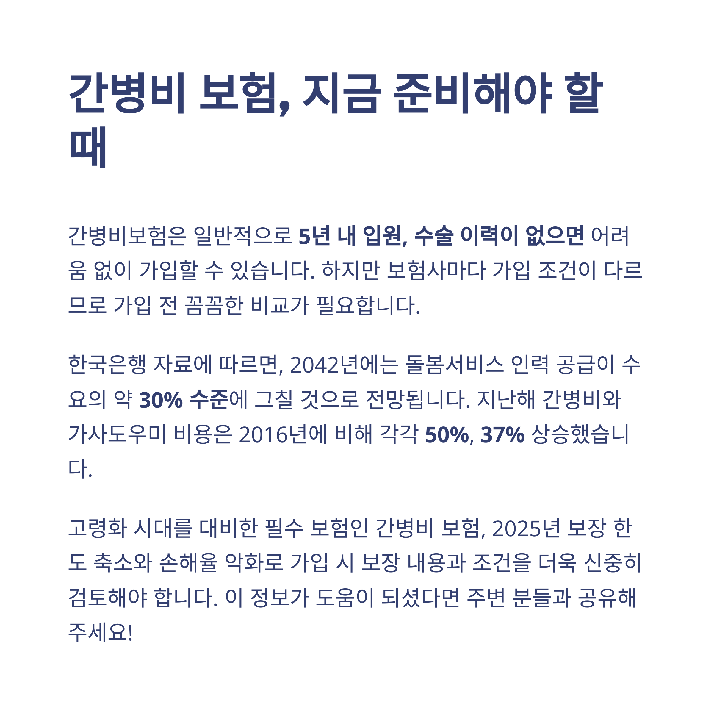 태그: 간병비보험, 간병인사용일당, 2025간병보험, 요양병원간병비, 우체국간병보험, 보험료축소, 손해율, 간호간병통합서비스, 고령화대비, 보험팁