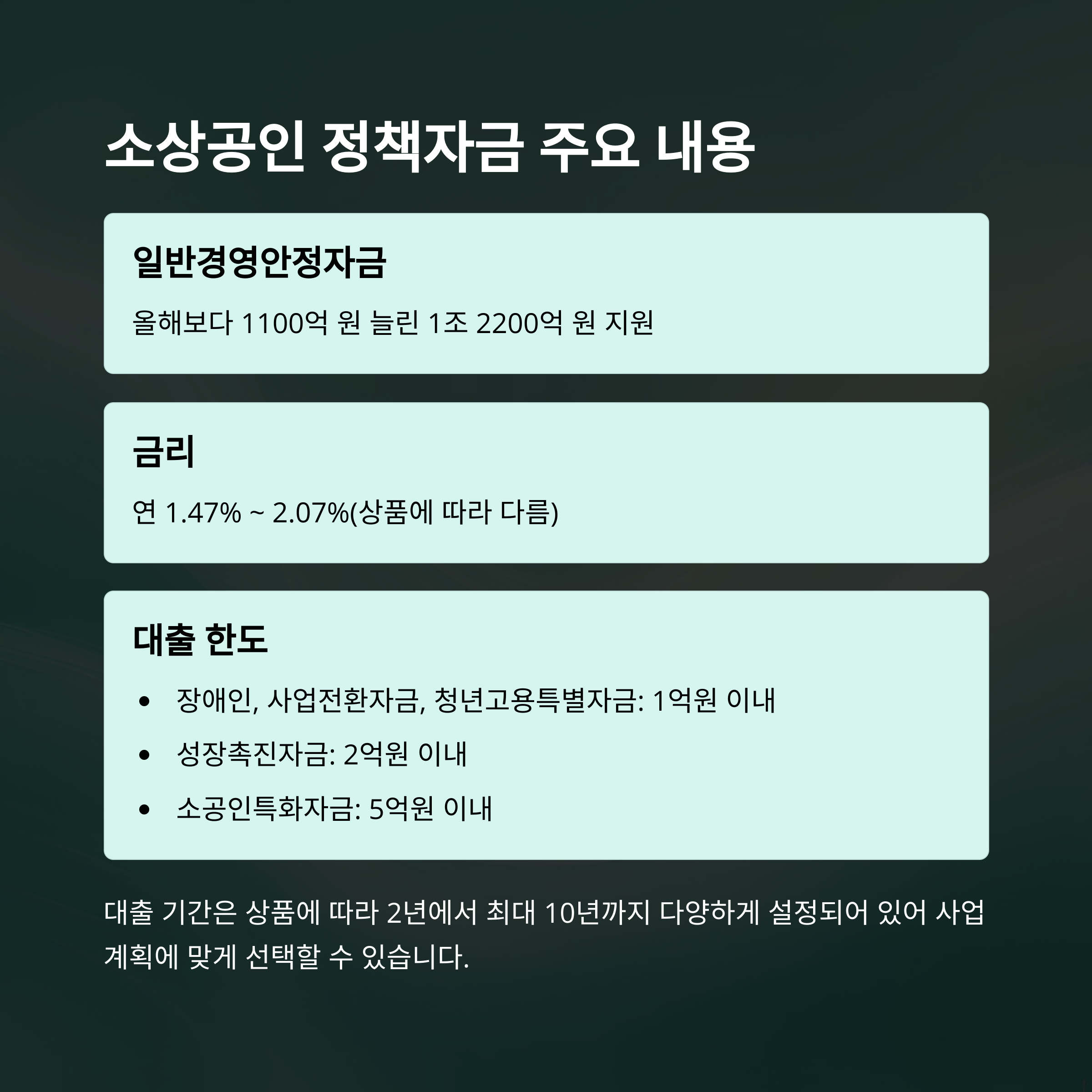 | 소상공인 정책자금 | 2.0%~2.5% | 최대 2억원 | 소상공인 |