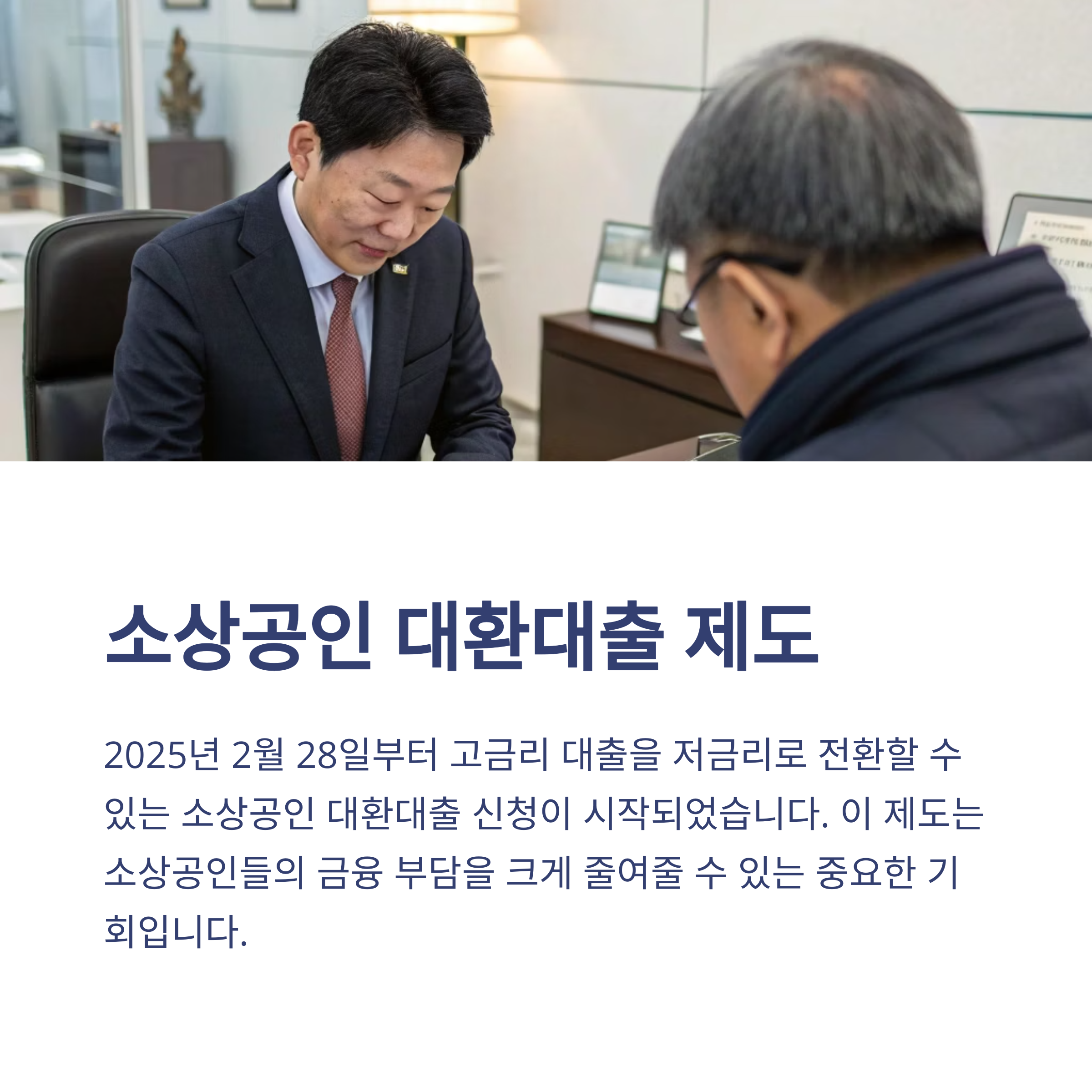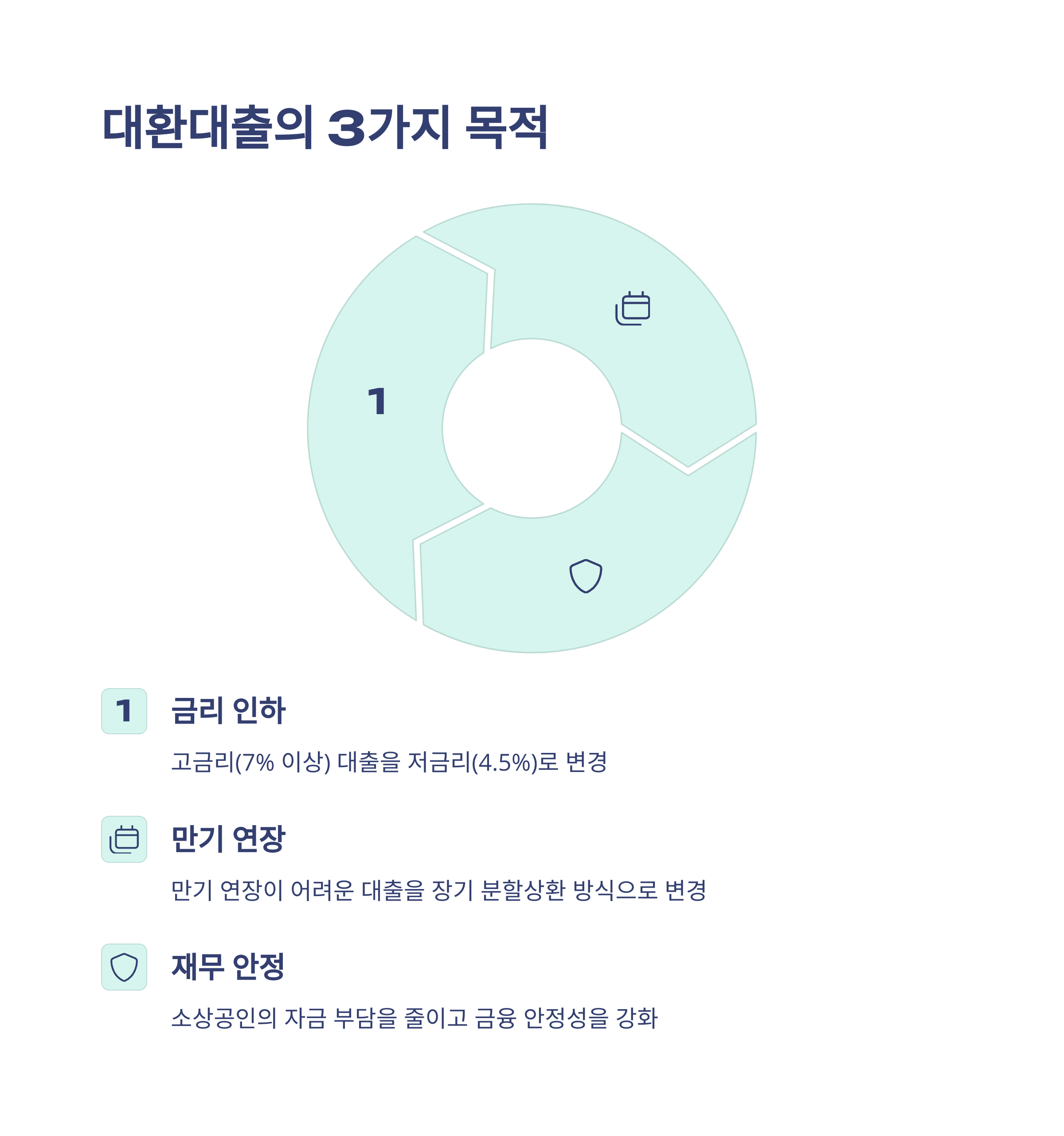 2025년 2월 28일부터 시작된 소상공인 대환대출 제도는 고금리 대출을 저금리로 전환하거나 단기 일시상환 대출을 장기 분할상환으로 전환할 수 있는 제도입니다. 금리 4.5%로 고정되어 있어 금융비용을 크게 절감할 수 있는 기회입니다.