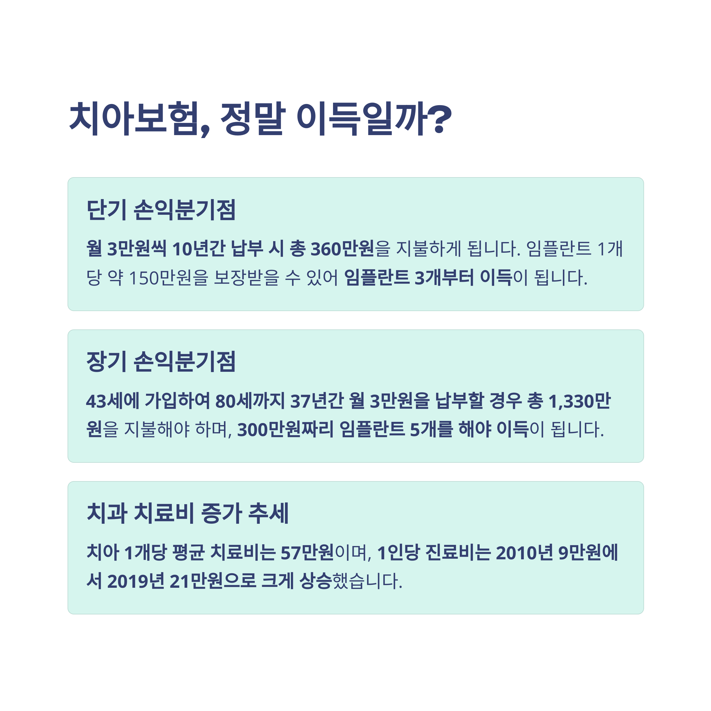 보험은 결국 '가성비' 게임이에요. 내가 낸 돈보다 많이 받으면 이득이고, 그렇지 않으면 손해죠. 예를 들어 월 3만원씩 10년간 내면 총 360만원. 그런데 임플란트 1개당 평균 150만원 보장된다고 치면, 3개 이상 치료받아야 본전이에요. 특히 갱신형 상품은 시간이 지날수록 보험료가 오르기 때문에 장기적으론 더 냉정하게 계산해야 합니다.