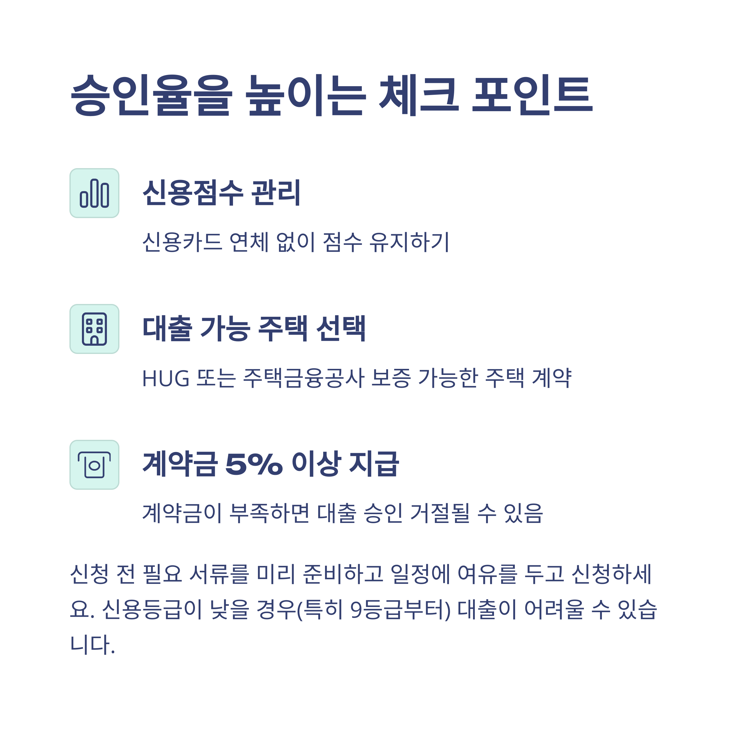 | 계약금 5% 이상 | 보증금 일부를 먼저 납부해야 대출 심사 진행 가능 |