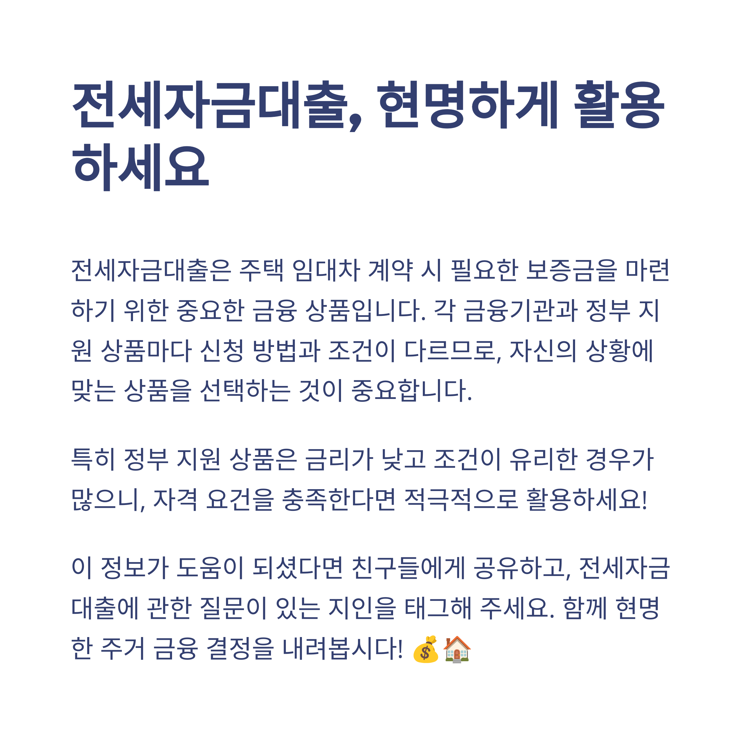 전세자금대출은 복잡해 보이지만, 차근차근 준비하면 누구나 받을 수 있는 제도입니다.