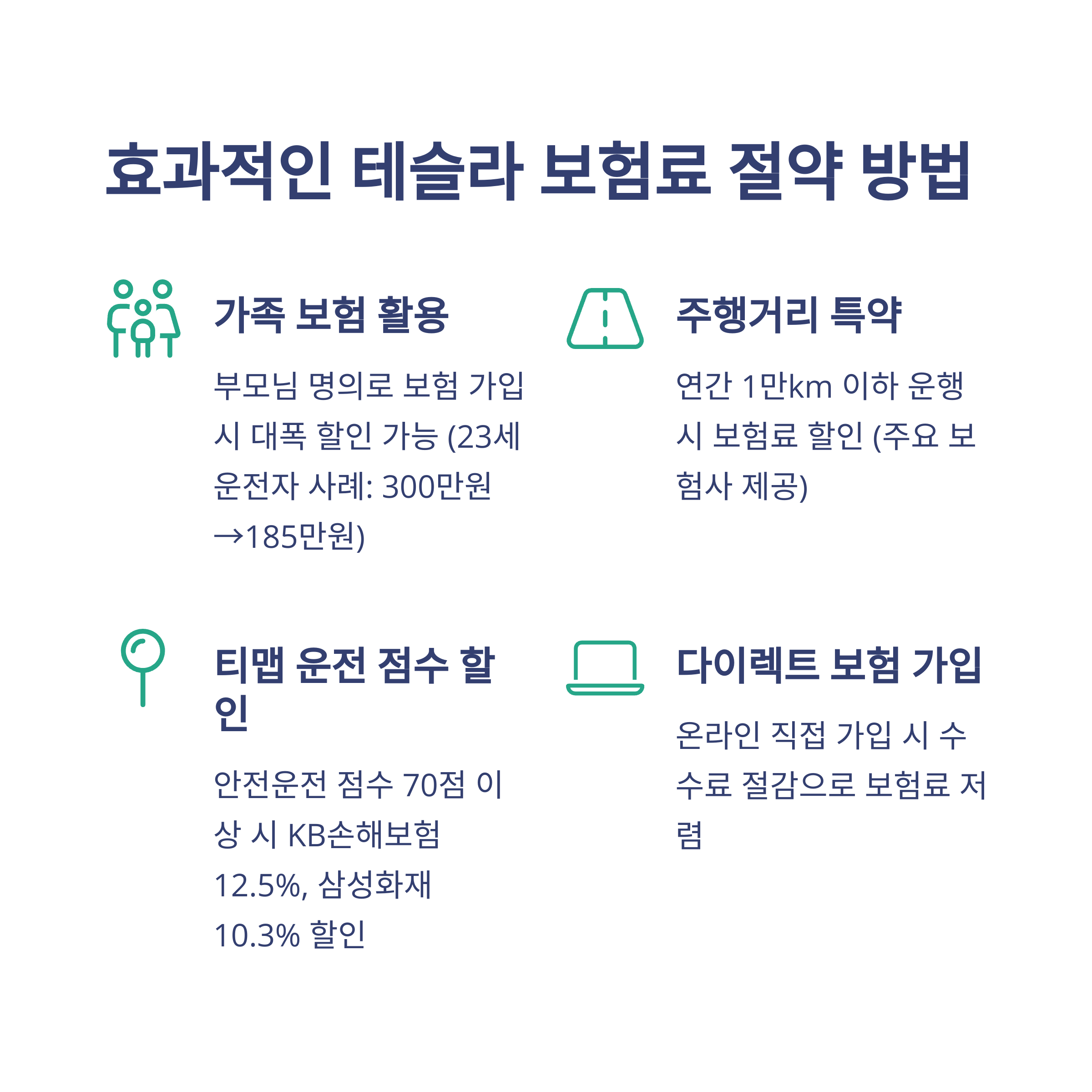 마일리지 특약, 티맵 운전 점수 할인, 가족 명의 활용 등입니다.