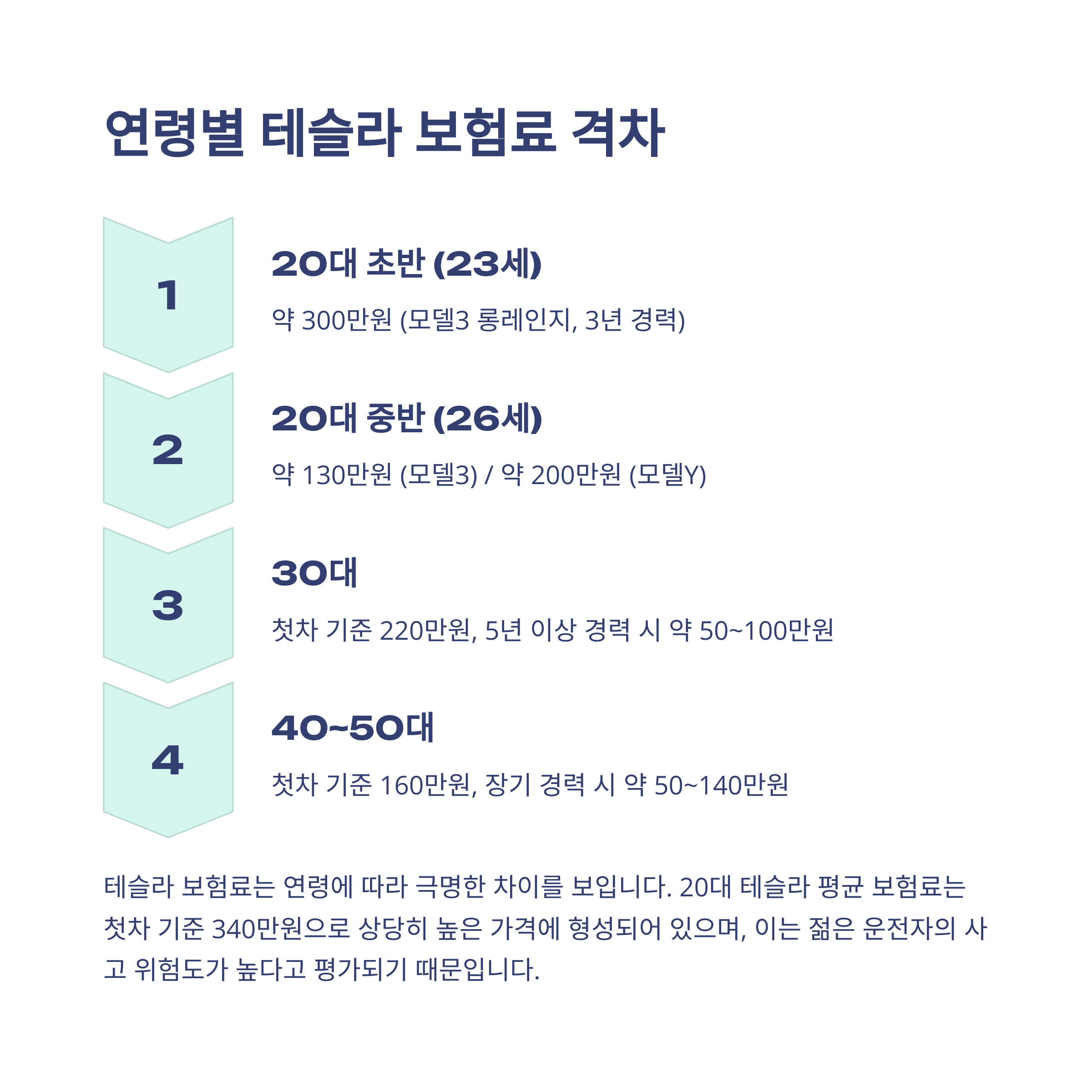 테슬라 보험료는 나이에 따라 정말 천차만별이에요. 특히 20대는 보험사 입장에서 ‘사고 위험군’으로 분류되기 때문에 어마무시한 가격이 매겨지죠. 평균적으로 첫 차 기준으로 20대는 340만원, 50대는 50만원 수준이라고 하니 이건 뭐 거의 7배 차이네요.