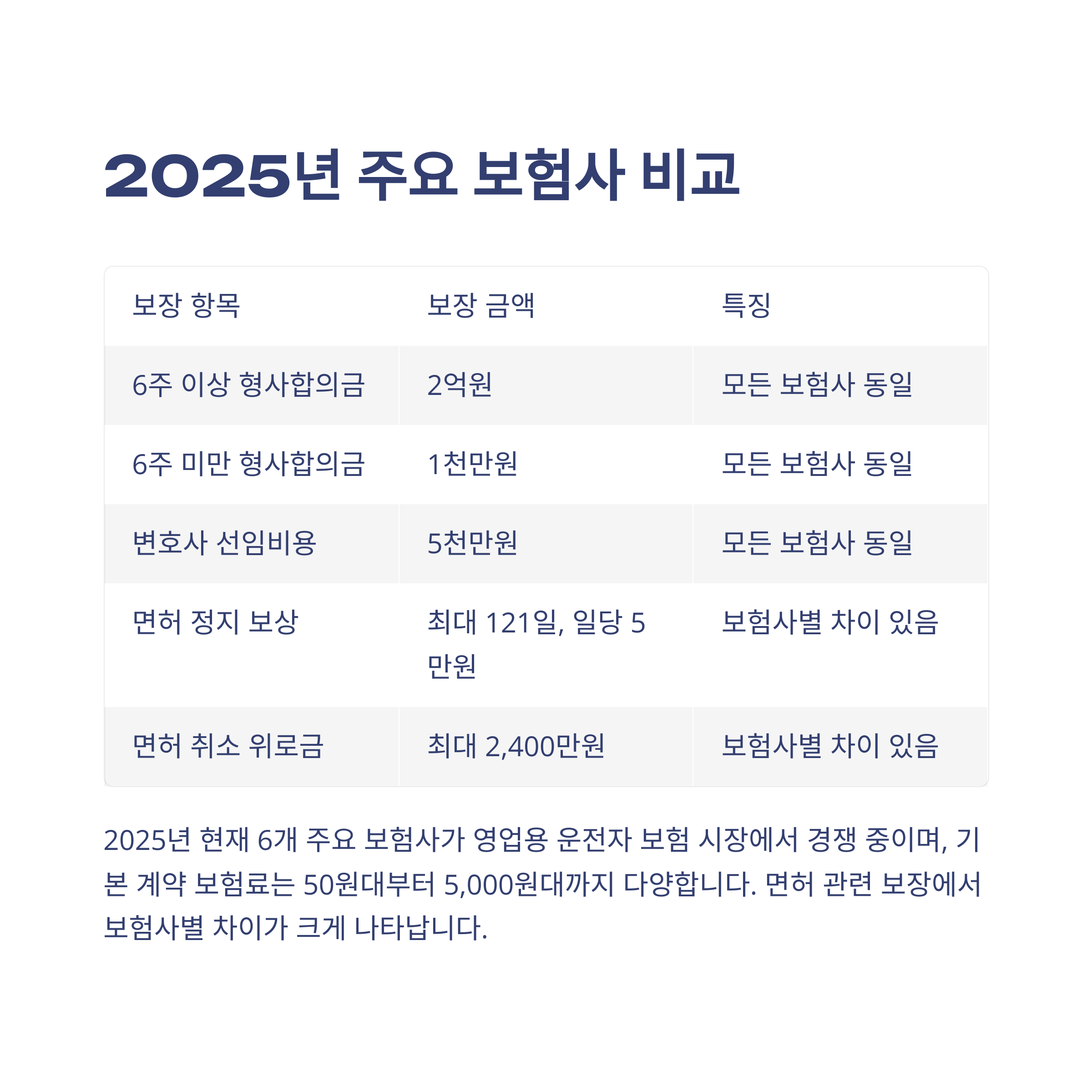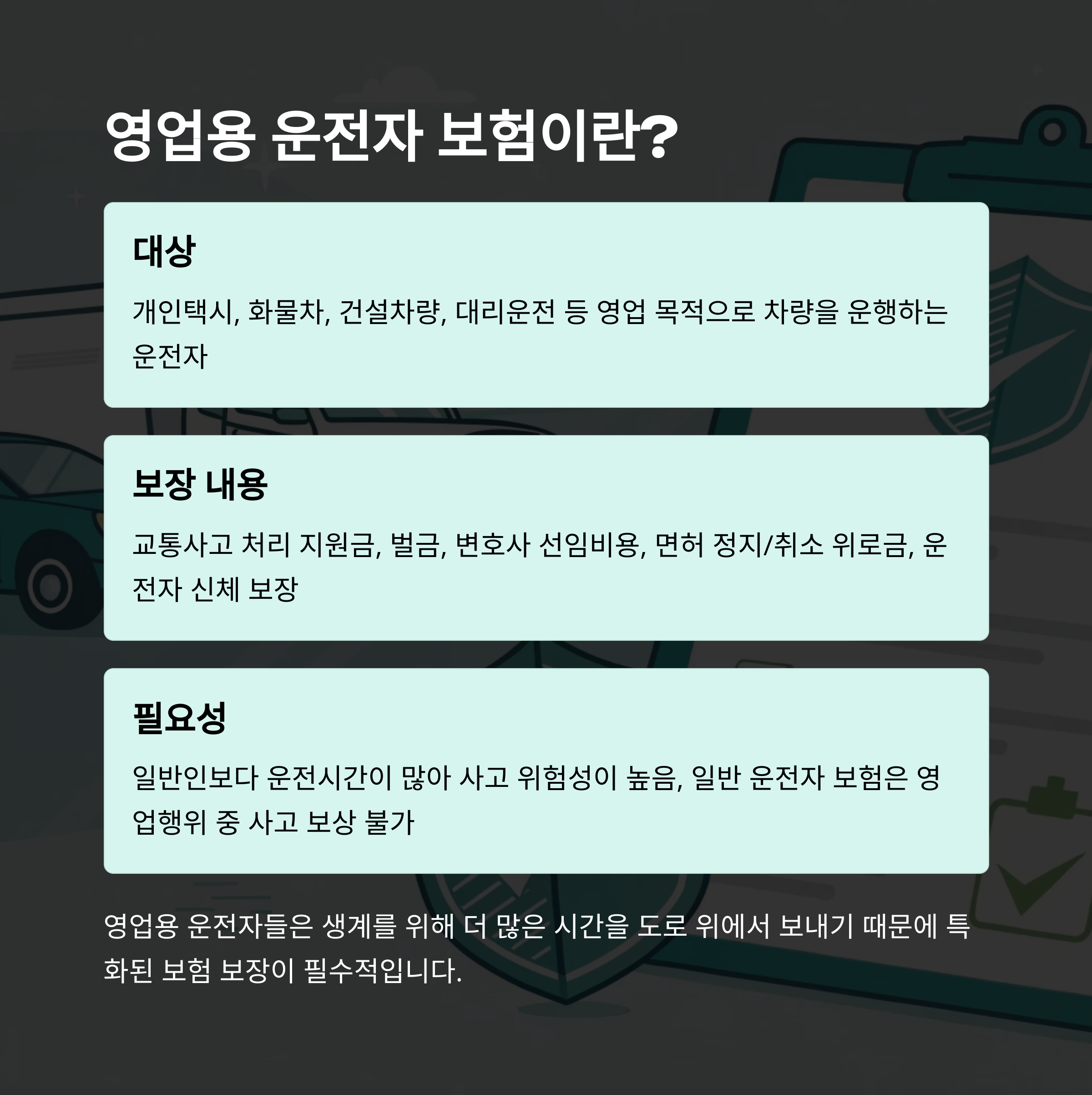 영업 중 사고는 일반 운전자 보험으로 보장받기 어렵기 때문에, 영업용 전용 보험은 사실상 필수입니다.