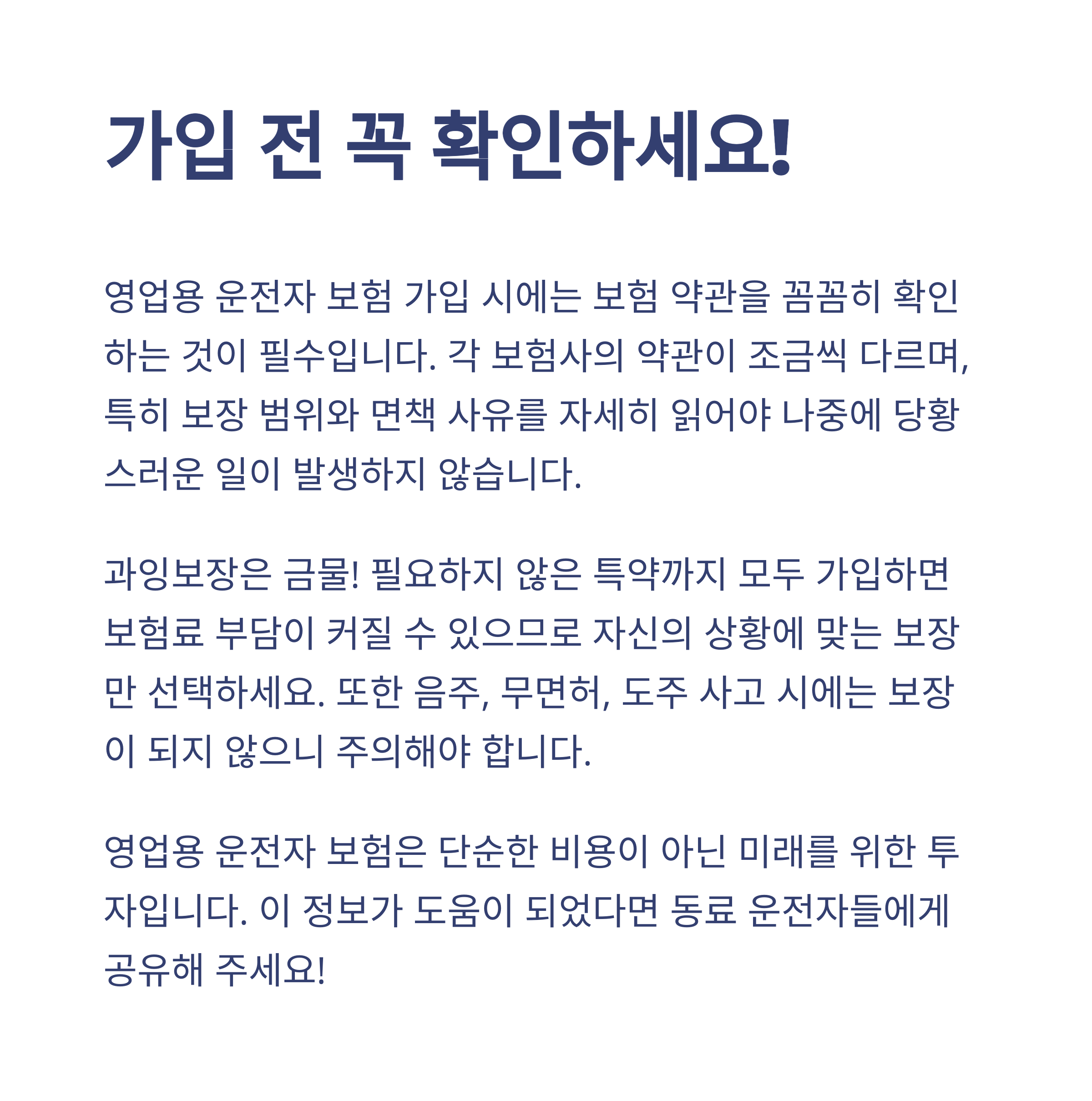 영업용 운전자 보험은 단순히 ‘혹시 몰라’ 준비하는 보험이 아닙니다. 사고 한 번이면 생계를 잃을 수 있는 분들에게는 생명줄 같은 존재이기 때문에, 실속 있게 준비하는 게 중요해요.