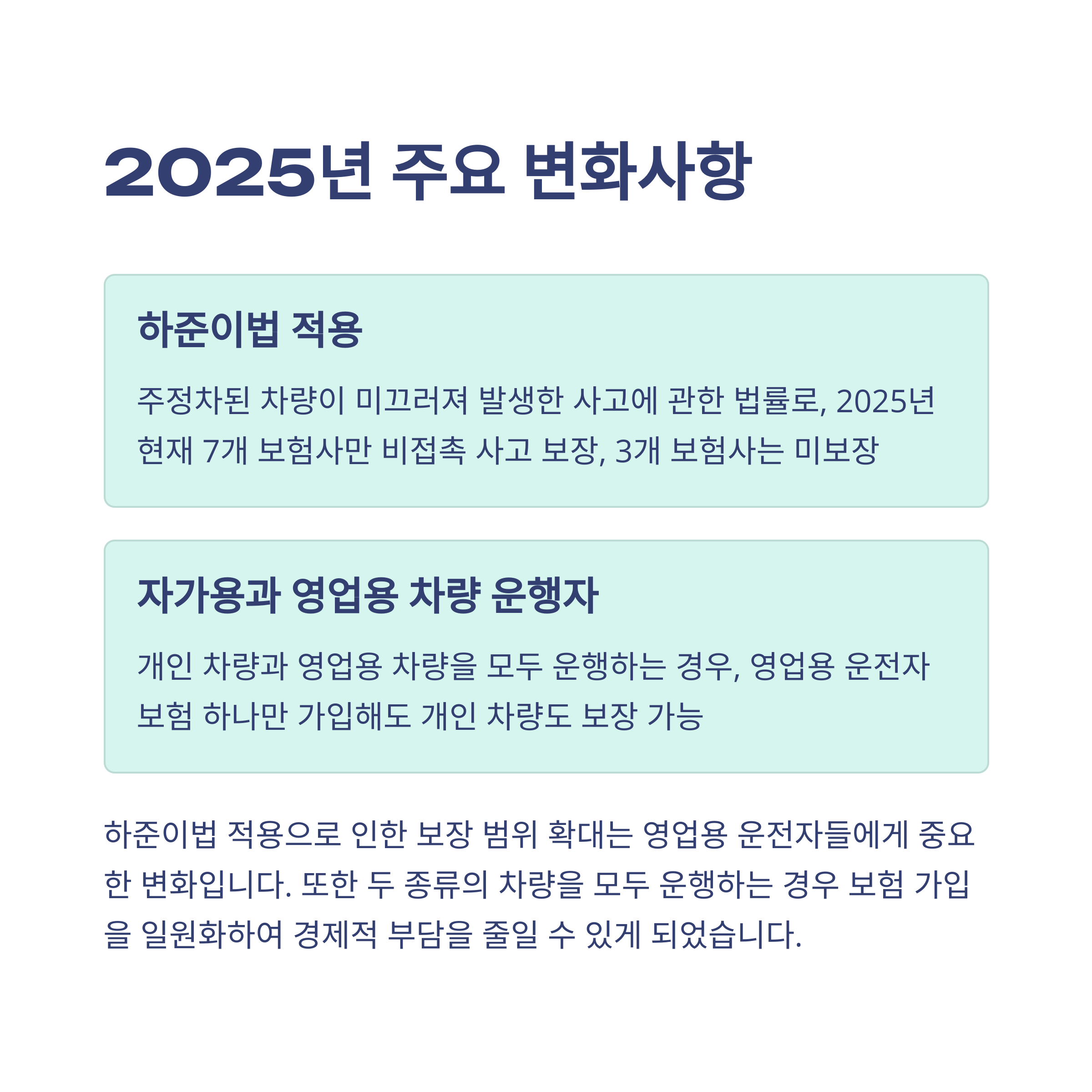 2025년에는하준이법 적용이 본격화되면서 보험사의 보장 항목도 더 세분화되고 있어요. 주차된 차량에서의 사고, 비접촉 사고에 대한 보장이 확대되는 추세인데요, 7개 보험사는 이미 해당 항목을 보장하고 있고 3개 보험사는 아직 미보장 상태입니다.