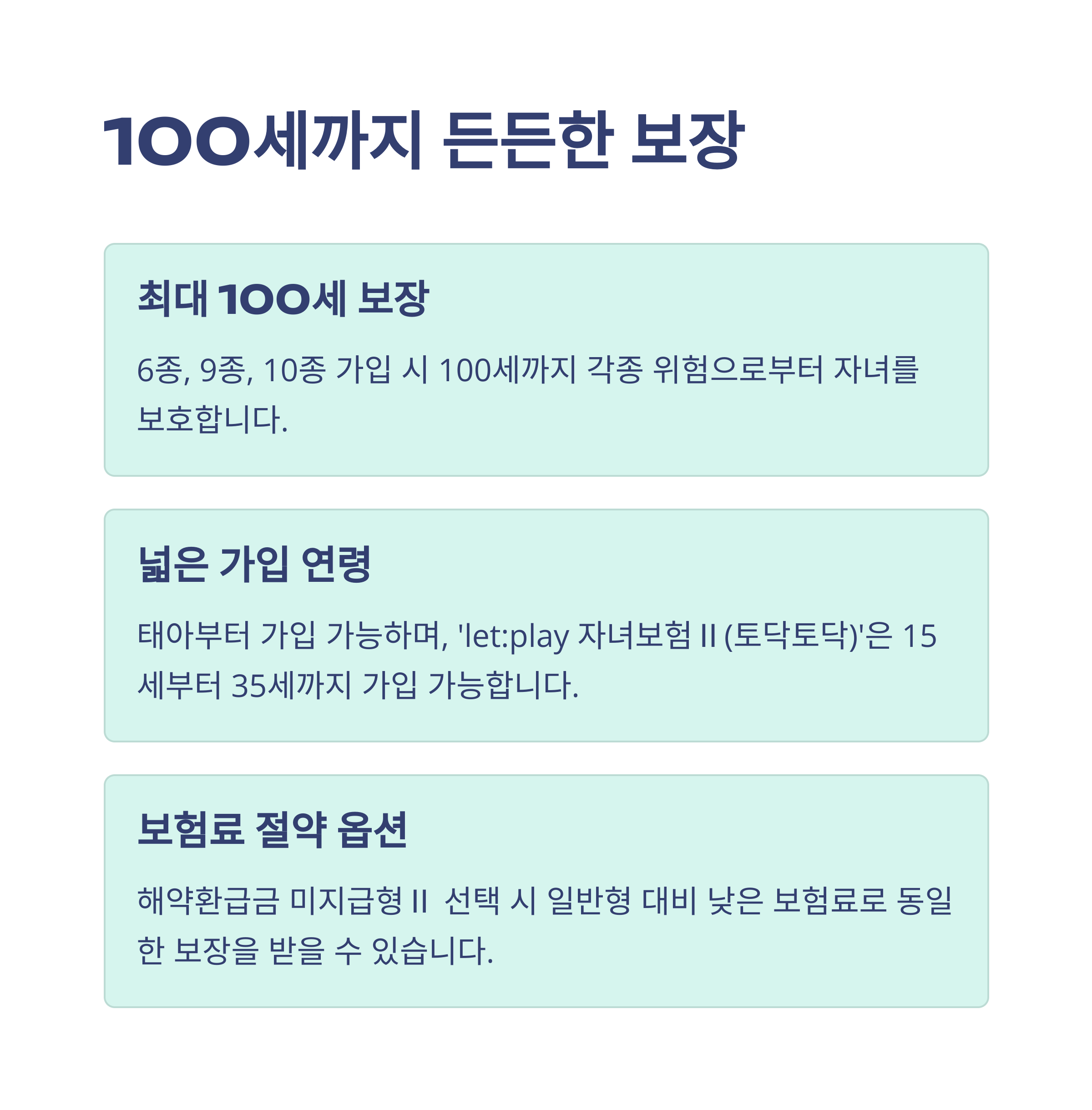 ‘무배당 let:play 자녀보험(도담도담)’은 태아부터 성인기까지 보장 가능한 롯데손해보험의 대표 자녀보험입니다. 특히 100세 만기 보장이 가능한 것이 가장 큰 장점이에요. 보장 형태는 6종, 9종, 10종 등으로 나뉘며, 가입연령도 유연해서 태아부터, 혹은 35세까지도 가입 가능한 구성도 있답니다. 특히 ‘토닥토닥’형은 청소년 및 청년층까지 아우르는 혁신적인 구성으로, '어른이' 세대에게도 매력적이에요.