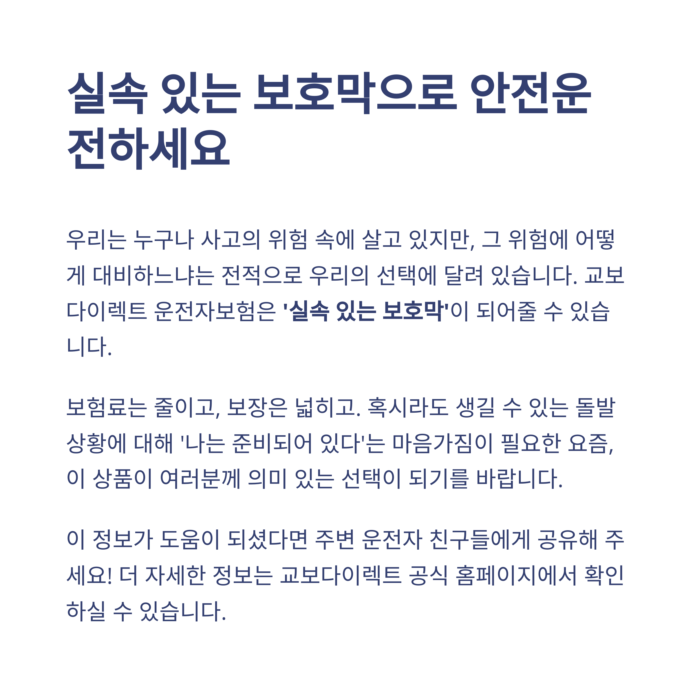 우리는 누구나 사고의 위험 속에 살고 있지만, 그 위험에 어떻게 대비하느냐는 전적으로 우리의 선택에 달려 있습니다. 교보다이렉트 운전자보험은 그런 의미에서 '실속 있는 보호막'이 되어줄 수 있습니다. 보험료는 줄이고, 보장은 넓히고. 혹시라도 생길 수 있는 돌발 상황에 대해 '나는 준비되어 있다'는 마음가짐이 필요한 요즘, 이 상품이 여러분께 의미 있는 선택이 되기를 바랍니다. 궁금한 점이나 직접 가입을 원하시면 공식 홈페이지에서 자세히 확인해 보세요.