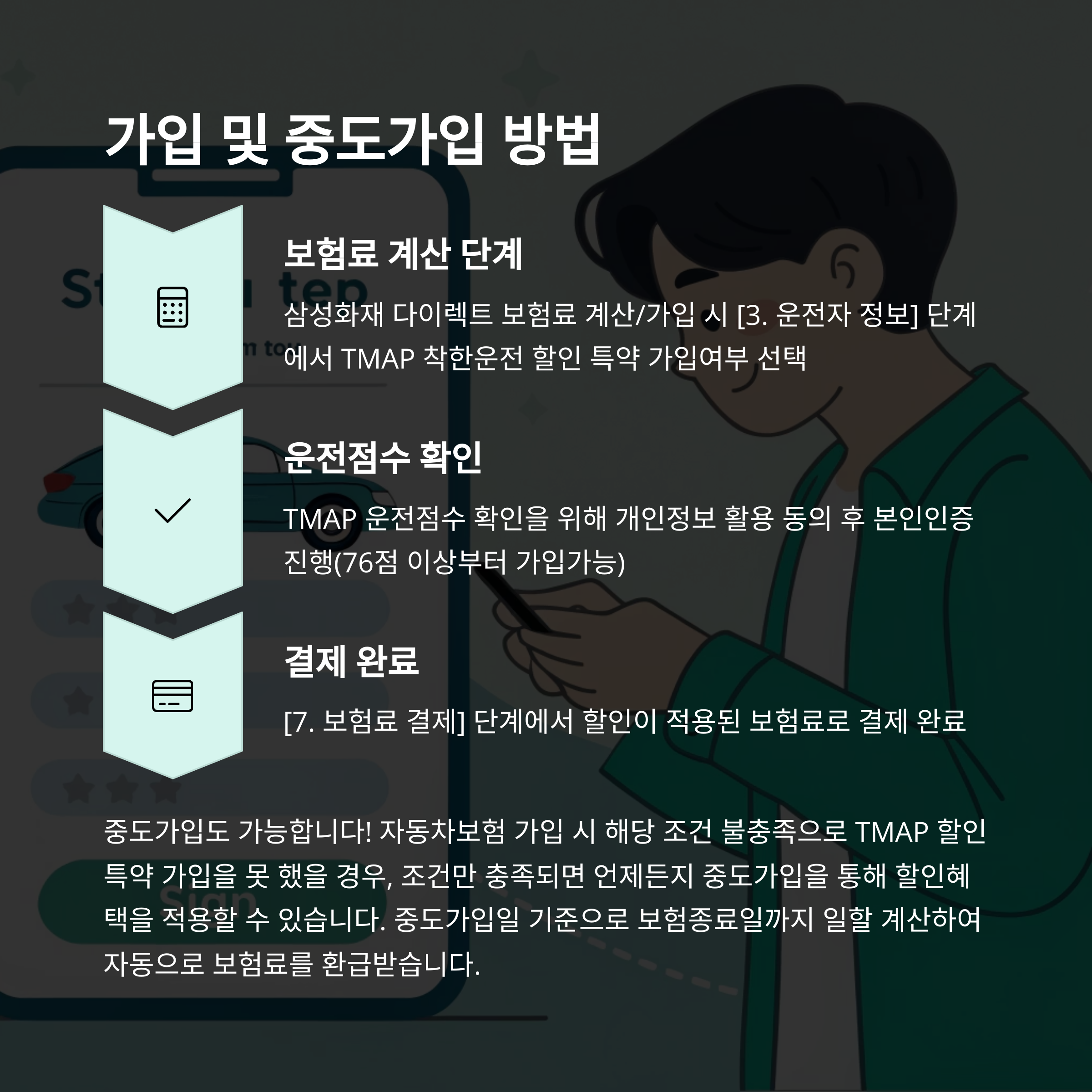 신규 가입 시에는 삼성화재 다이렉트 웹사이트(가입 바로가기)에서 보험료 계산 후, 운전자 정보 입력 단계에서 TMAP 할인 특약을 선택할 수 있어요. 점수 확인 및 본인 인증을 거쳐 76점 이상일 경우 자동 적용됩니다.