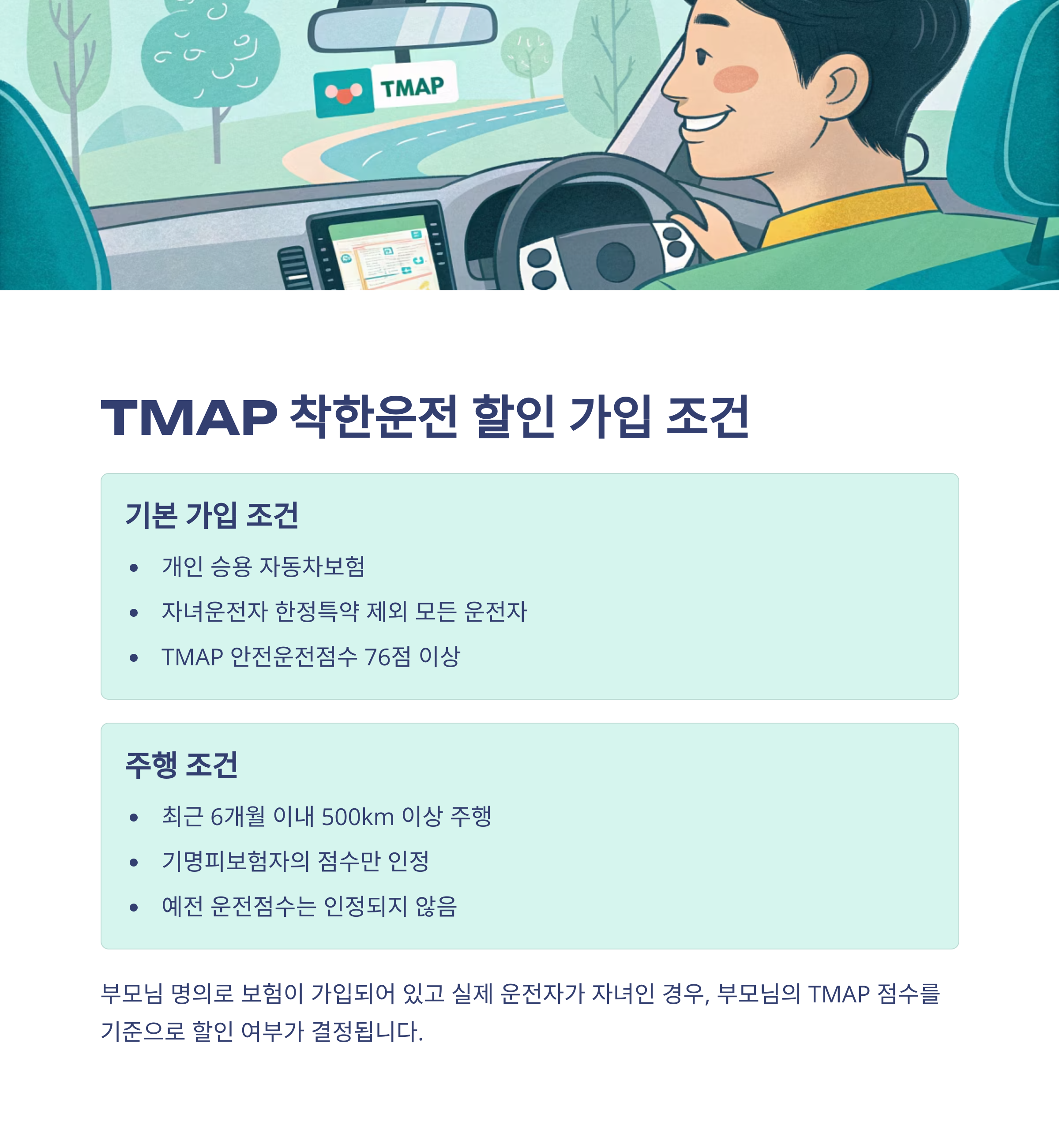 무엇보다 중요한 건 최근 6개월 이내 TMAP 앱으로 500km 이상 주행해야 하고, 안전운전 점수가 76점 이상이어야 해요. 과거 운전 기록은 무용지물이고요, 현재 기록이 기준입니다. 부모님 명의로 가입했어도 실제 운전자가 자녀라면 부모님의 TMAP 점수가 반영된다는 것도 팁!