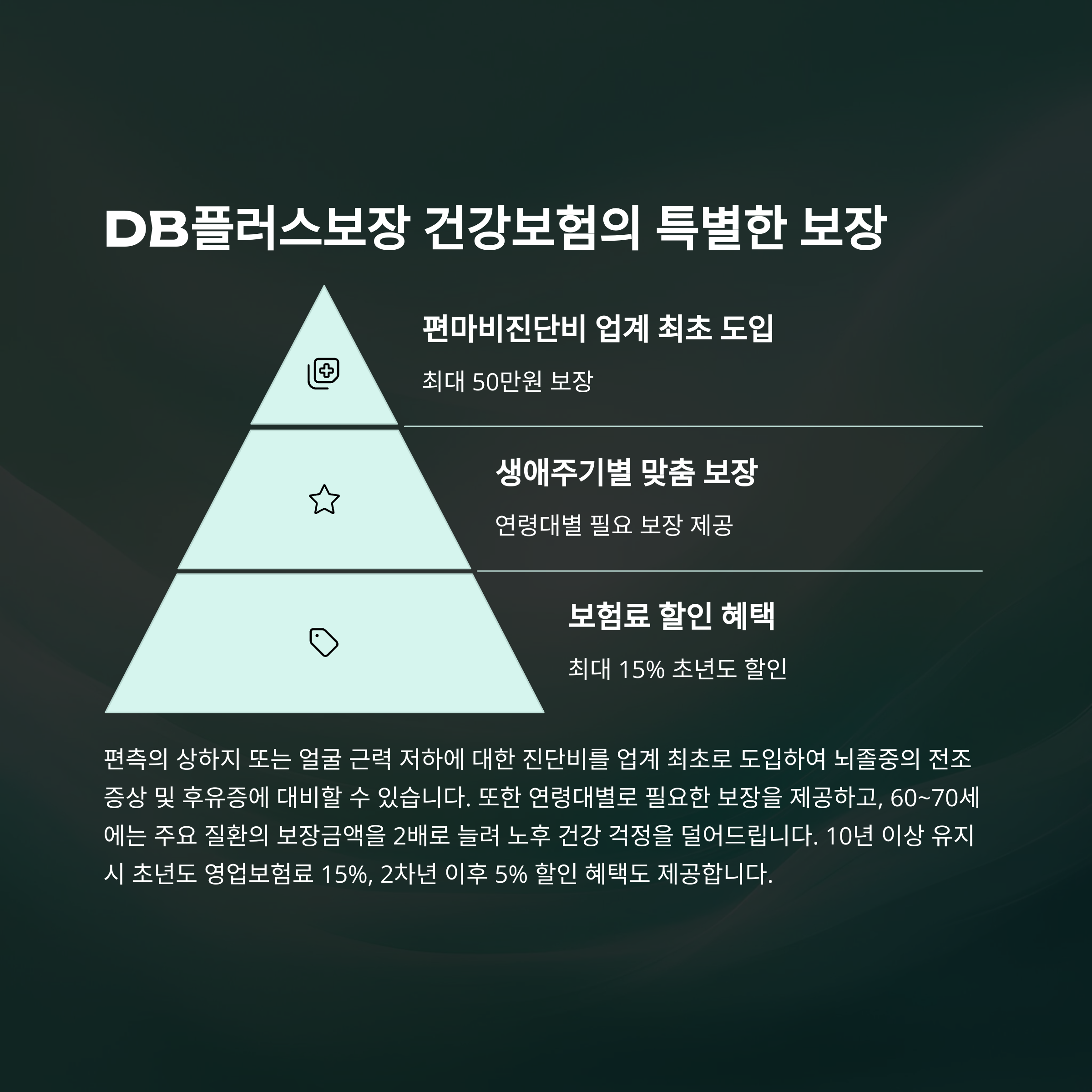 DB플러스보장 건강보험은 2022년 2월에 출시되어 2023년 기준으로 월 1300여 건이 판매될 정도로 꾸준한 인기를 끌고 있는 상품입니다. 이 상품의 가장 큰 매력은 바로 '편마비진단비'를 업계 최초로 도입했다는 점이에요. 편마비 진단 시 최대 50만원을 보장해준다고 하니, 뇌졸중의 전조 증상이나 후유증에 대한 대비를 할 수 있다는 점에서 정말 실질적인 도움을 줄 것 같다는 생각이 들었습니다. 제 지인 중에도 뇌졸중으로 고생하신 분이 있는데, 이런 특약이 있었다면 얼마나 좋았을까 싶더라고요.