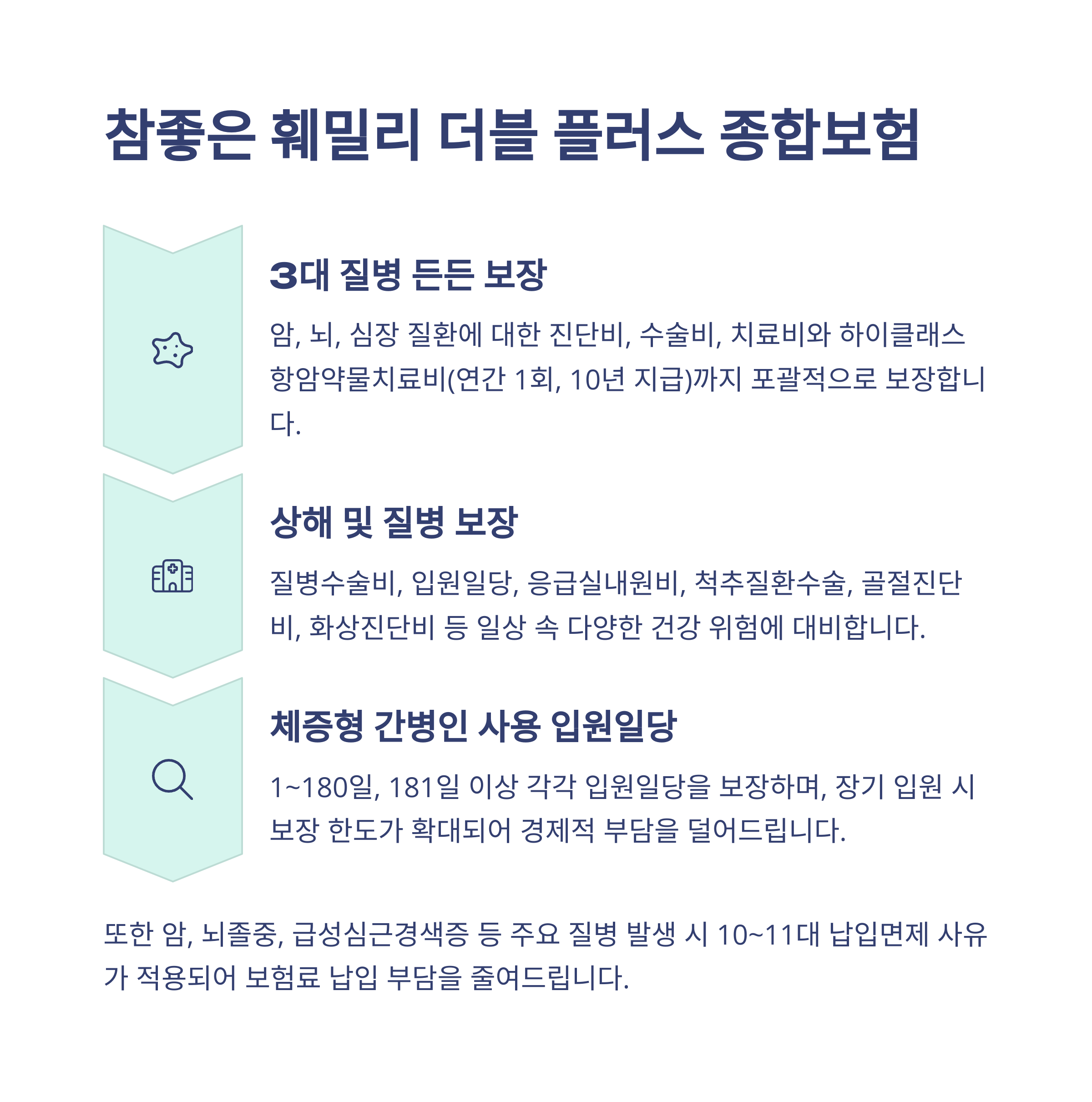 마지막으로 살펴볼 상품은 '참좋은 훼밀리 더블 플러스 종합보험'입니다. 이름처럼 가족을 위한 든든한 보장이 강점인데요, 특히 3대 질병(암, 뇌, 심장)에 대한 보장이 매우 튼튼합니다. 진단비, 수술비, 치료비는 물론, 연간 1회, 10년간 지급되는 하이클래스 항암약물치료비까지 포함되어 있어 고액 치료비 걱정을 덜어줄 수 있을 것 같아요. 암 치료는 정말 돈이 많이 드는데, 이런 부분까지 신경 쓴 점이 참 마음에 들었습니다.