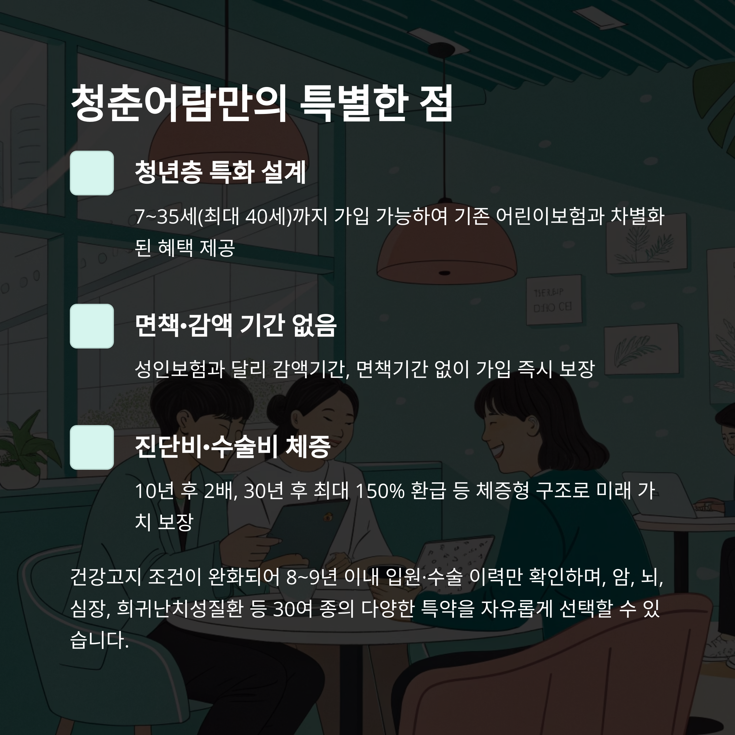 청춘어람 보험은 기존 어린이보험의 장점을 계승하면서, 성장기와 청년기, 그리고 성인기 초입까지의 건강 리스크를 폭넓게 보장하기 위해 7세부터 가입이 가능하도록 설계되었어요. 어릴 때부터 미리 준비해서 쭉 이어갈 수 있다는 장점이 있는 거죠. 저도 어렸을 때 이런 보험이 있었으면 좋았겠다는 생각을 했어요!