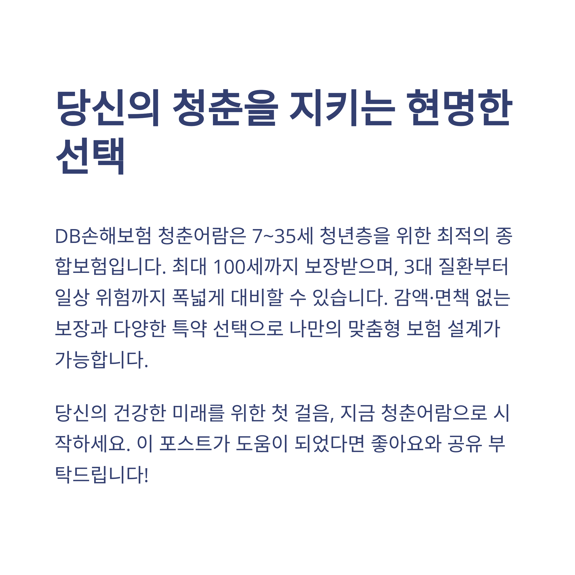 안녕하세요, 여러분! 요즘 젊은 세대들은 ‘건강은 건강할 때 지켜야 한다’는 말을 그 어느 때보다 실감하고 있는 것 같아요. 저도 예전엔 보험이 어렵고 복잡하게만 느껴졌는데, 막상 닥쳐보니 미리 대비하는 게 얼마나 중요한지 깨달았거든요. 오늘은 특히 7세부터 35세까지의 청춘들을 위한 DB손해보험의 '청춘어람 보험'에 대해 자세히 파헤쳐 볼까 합니다. 2025년 최신 정보를 바탕으로 어떤 보장들이 우리를 기다리고 있는지, 함께 알아볼까요?