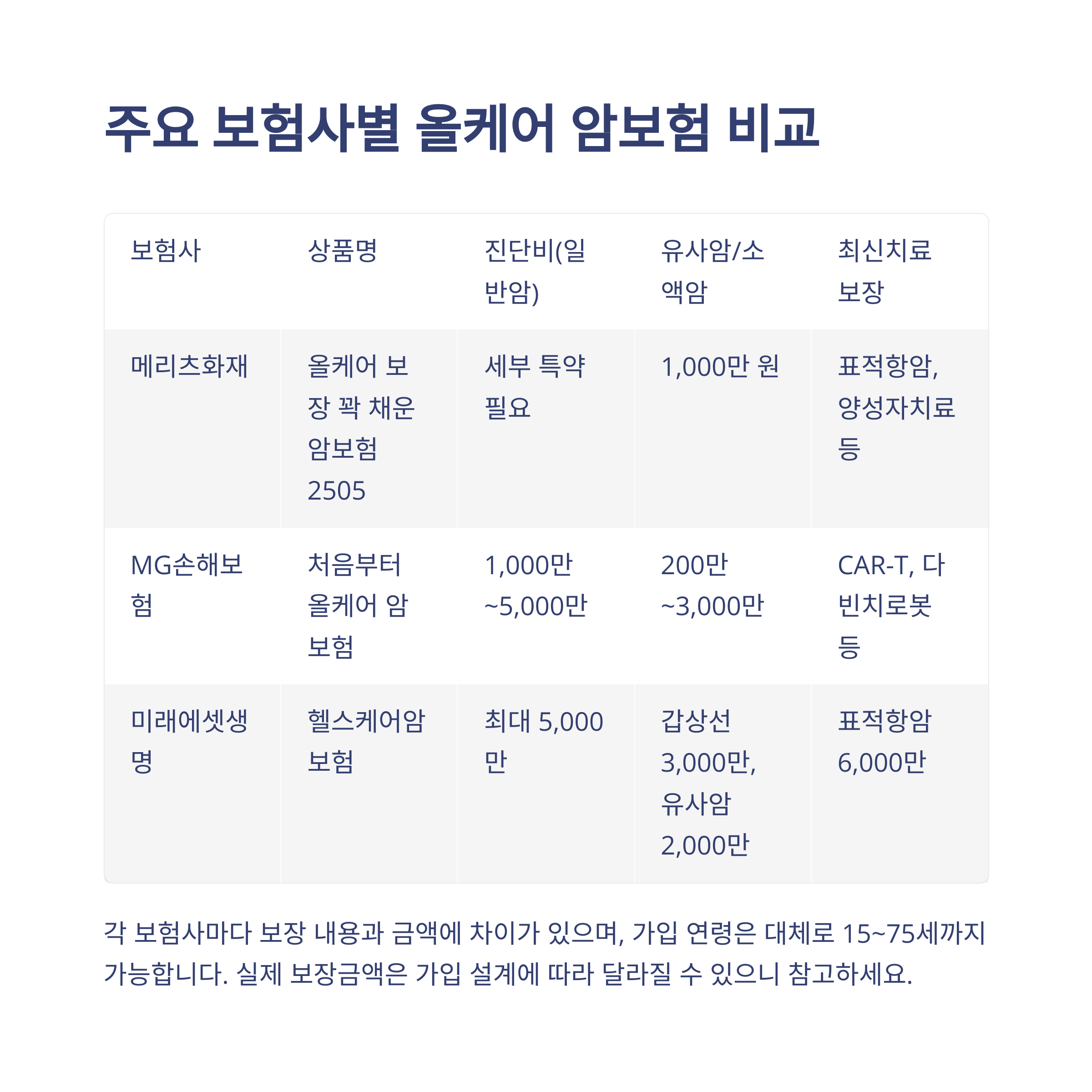 | 메리츠화재 | 올케어 암보험2505 | 일반암 최대 3,000만 원 | 표적항암, 재진단암 등 | 10대 특정암 특약 강화 |