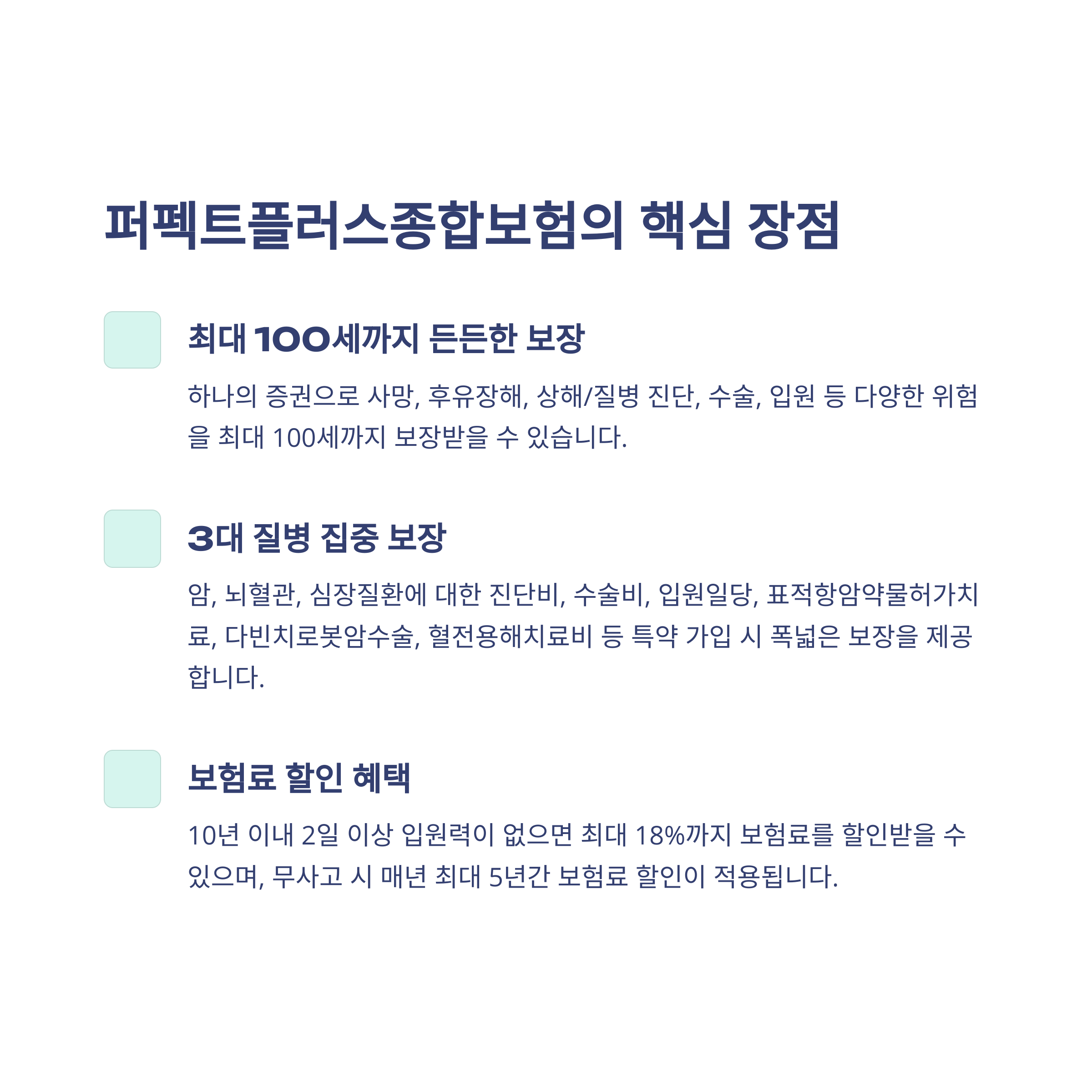 | 3대 질병 집중 보장 | 암, 심장, 뇌질환 진단/수술/치료/입원 보장 가능 |