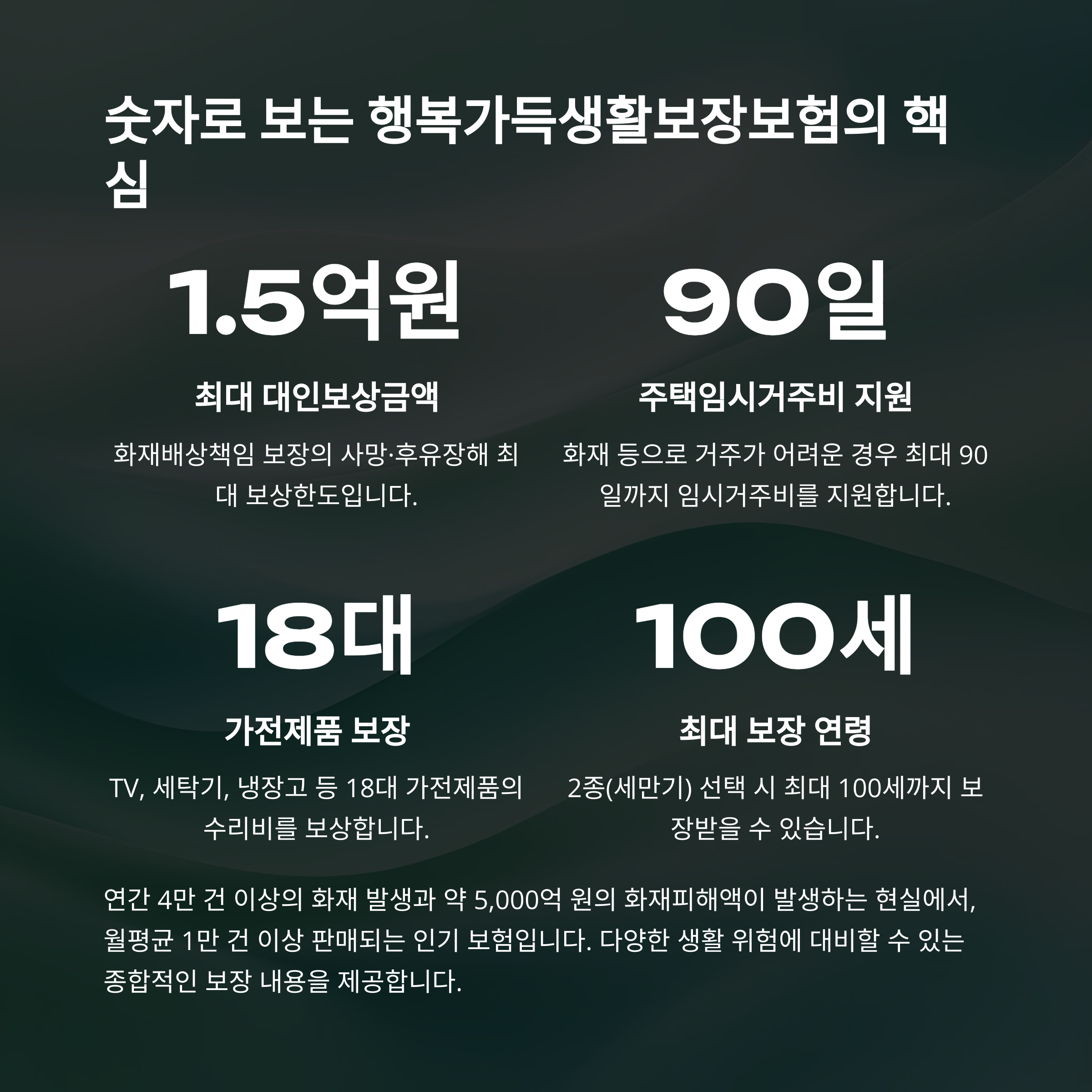 | 화재배상책임 (대인) | 사망·후유장해: 최대 1.5억 원 / 부상: 최대 3천만 원 |